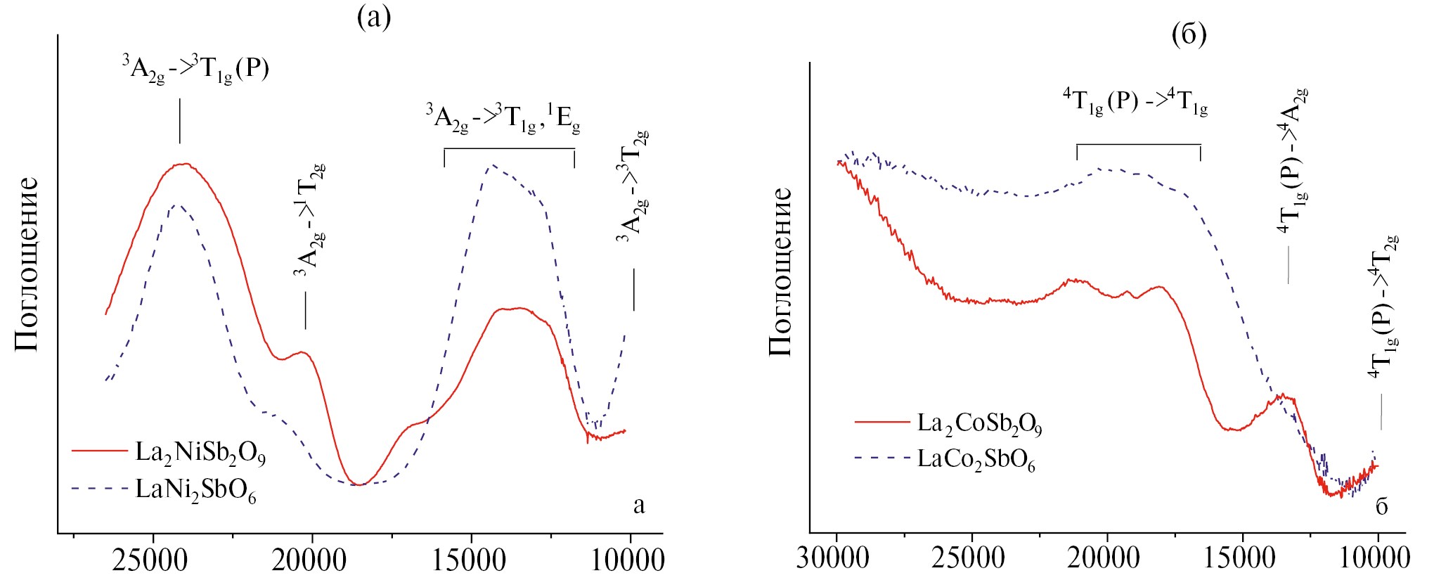 В спектрах октаэдрически координированного Со2+ обычно наблюдаются две интенсивные полосы в областях 8000–10 000 и 16 000–20 000 см–1, связанные с разрешенными переходами 4T1g(P) → 4T2g и 4T1g(P) → 4T1g соответственно [51]. Полоса 4T1g(P) → 4T1g, как правило, имеет мультиплетную структуру из-за примешивания запрещенных по спину переходов. В области 11 000–14 000 см–1 фиксируется менее интенсивный переход 4T1g(P) → → 4A2g, часто имеющий вид плеча на низкоэнергетической стороне полосы перехода 4T1g(P) → 4T1g. Спектры LaСо2SbO6, La3Со2SbO9, так же как и спектр La3Со2Sb3O14, приведенного в качестве образца сравнения, имеют все перечисленные особенности, что указывает на присутствие в этих соединениях ионов Co2+ в октаэдрическом окружении. Различная степень расщепления наблюдаемых переходов объясняется структурными особенностями этих соединений.
