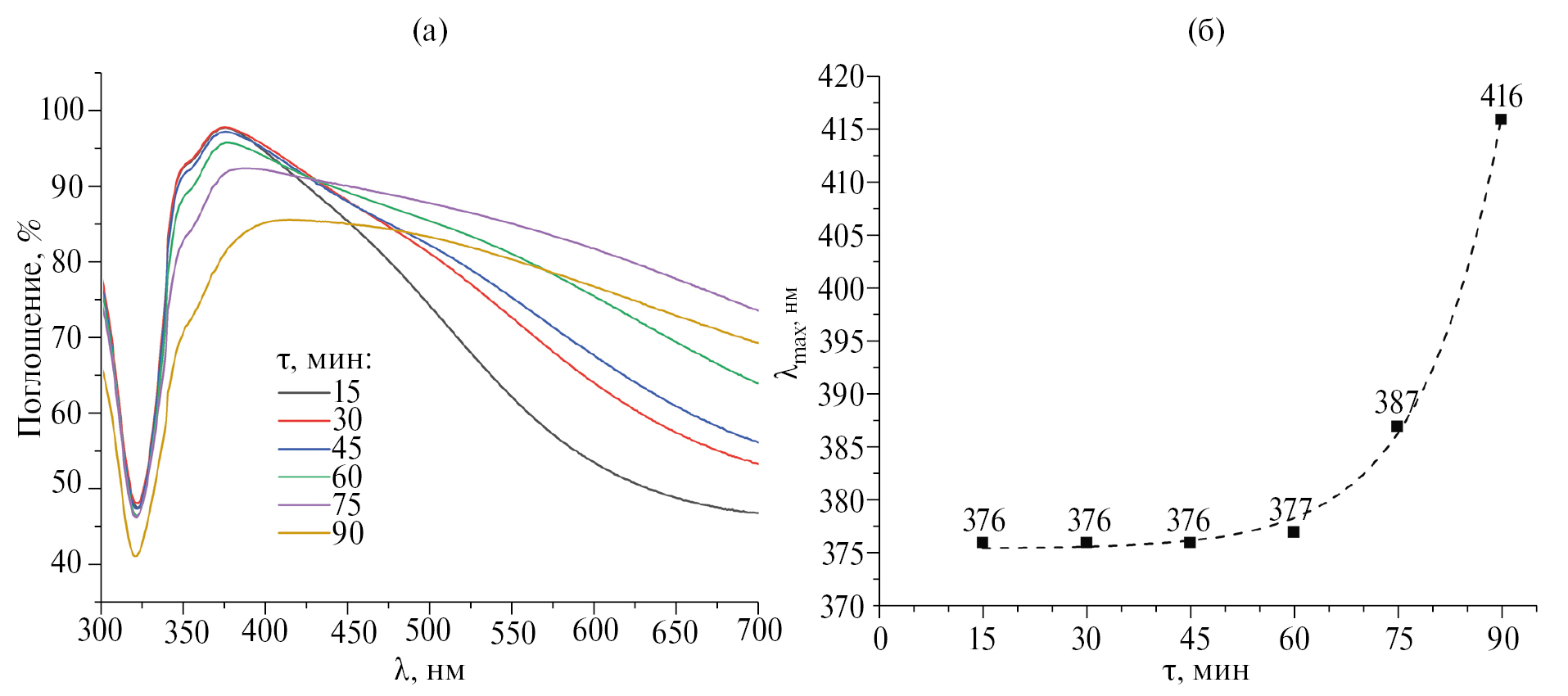 Рис. 1. УФ-Вид-спектры поглощения реакционной системы после ее термообработки в течение различного времени (а) и зависимость положения максимума полосы поглощения от длительности процесса (б)