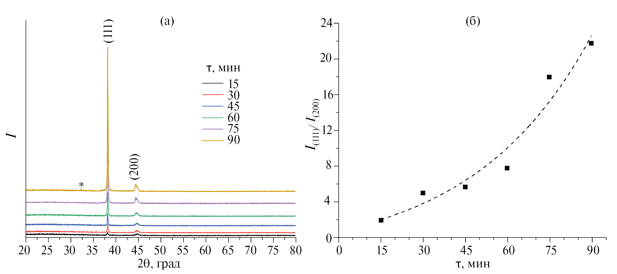 Рис. 2. Рентгенограммы пленок на основе серебряных наноструктур, сформированных при различном времени полиольного синтеза (маркером * обозначен рефлекс, характерный для Ag2O) (а), и зависимость отношения интенсивностей рефлексов (111) и (200) от длительности процесса (б)