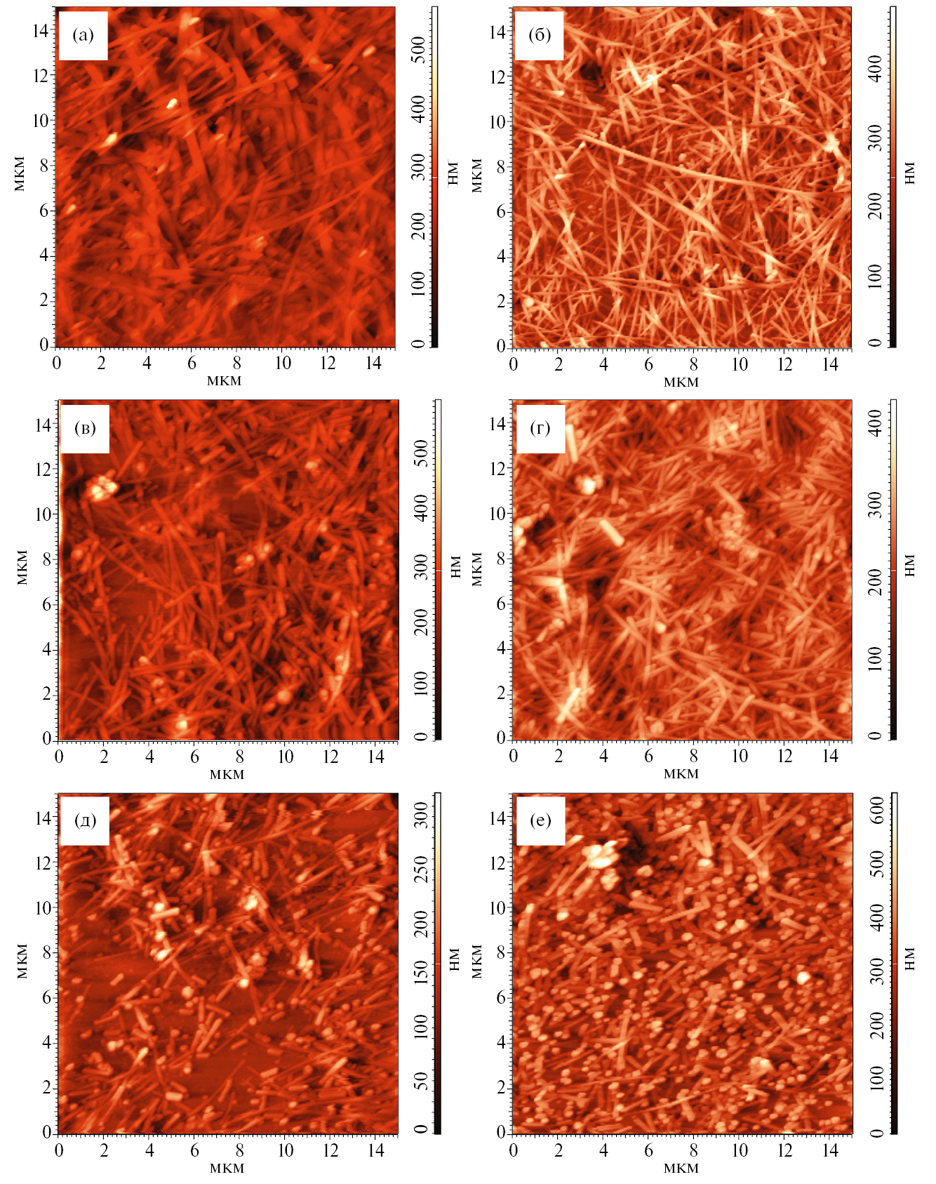 Результаты анализа поверхности полученных материалов методом АСМ (рис. 4) хорошо согласуются с данными растровой электронной микроскопии. Наблюдается тенденция к постепенному увеличению длины серебряных нанопроволок через 30–45 мин после начала полиольного синтеза с некоторым увеличением концентрации примесей, представляющих собой микростержни и нульмерные частицы. Через 60 мин имеет место существенное ускорение процесса разрушения Ag-НП, которое сопровождается уменьшением их длины и ростом концентрации указанных выше более мелких образований.