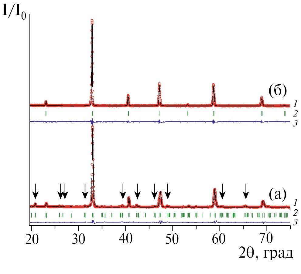 Рис. 3. Рентгенографические данные для Gd0.3Sr0.7Co1–yFeyO3–δ, где y = 0.2 (а) и y = 0.7 (б), обработанные по методу Ритвельда. Точки – данные эксперимента, 1 – теоретический спектр; 2 – местоположение максимумов с разрешенным набором индексов Миллера (hkl); 3 – разница между экспериментальными данными и теоретической кривой. Стрелки указывают на сверхструктурные рефлексы для тетрагональной ячейки 2ap × 2ap × 4ap