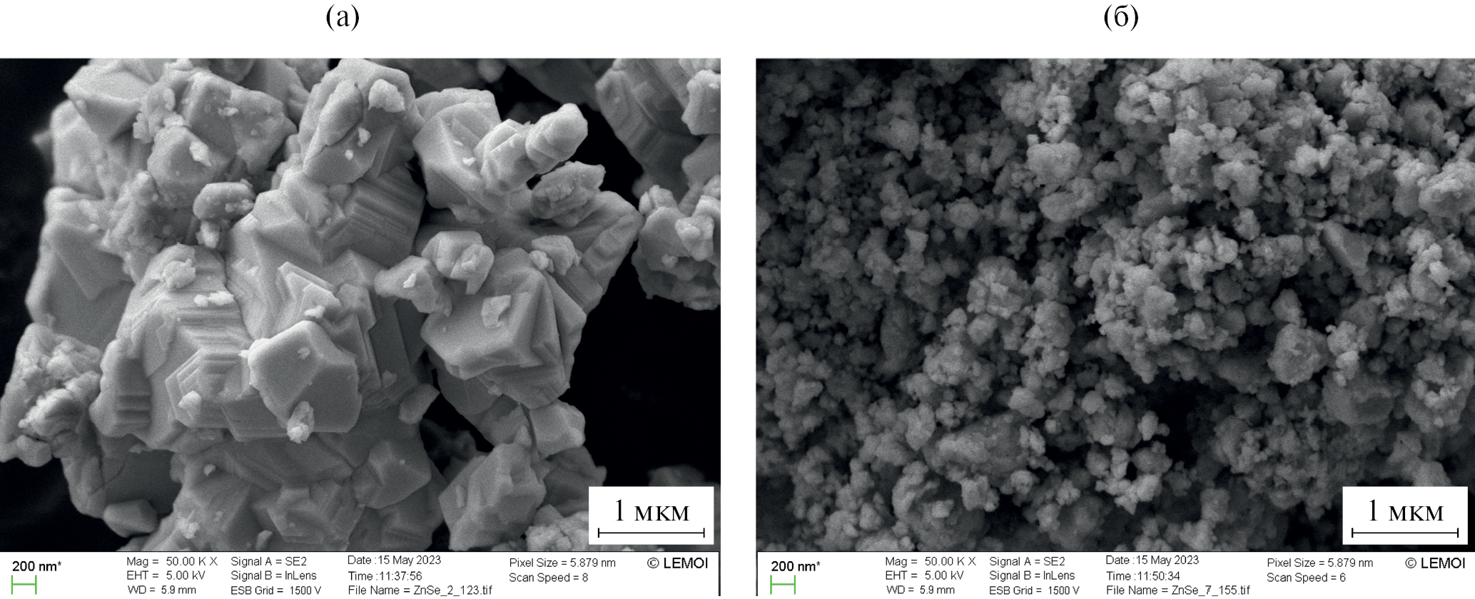 Морфологию порошков исследовали с помощью сканирующего электронного микроскопа высокого разрешения S-5500 (Hitachi High-Tech. Corp., Япония). Измерение удельной поверхности (SБЭТ) порошков проводили методом адсорбции азота на приборе Sorbi-MS (Мета, Россия) при использовании уравнения Брунауэра–Эммета–Теллера (БЭТ). Эквивалентный диаметр частиц (dБЭТ, нм) рассчитывали в предположении сферичности их формы: dБЭТ = 6000/(ρ × SБЭТ), где ρ – теоретическая плотность ZnSe (5.27 г/см3). Гранулометрический состав порошков определяли методом динамического рассеяния света в водной среде с использованием анализатора размера частиц и ζ-потенциала NanoBrook 90Plus Zeta (Brookhaven Instr. Corp., США). Измерения проводили в диапазоне размеров частиц от 1 нм до 10 мкм предварительной деагломерацией порошков ультразвуковой обработкой и добавлением поверхностно-активного вещества DOLAPIX.