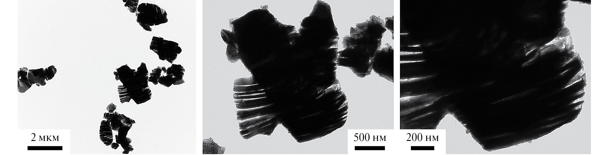 На рис. 1 представлена микроструктура полученного многослойного максена Ti0.2V1.8CTx по данным ПЭМ. Как видно из рис. 1, размер агрегатов варьирует по диаметру от 0.3 до 1.5 мкм, а по толщине от 0.35 до 2.5 мкм. При этом иногда встречаются относительно малослойные агрегаты толщиной ~30–150 нм, вероятно, отслоившиеся от крупных частиц. Расстояние между явно выделенными стопками максенов в составе аккордеоноподобного агрегата изменяется в интервале от 10 до 80–90 нм. Большое увеличение микроструктуры показывает, что на краю максеновых частиц могут встречаться мелкие глобулярные образования диаметром <5–15 нм, которые можно отнести к продуктам деградации максена, образовавшимся в ходе его промывки и сушки.