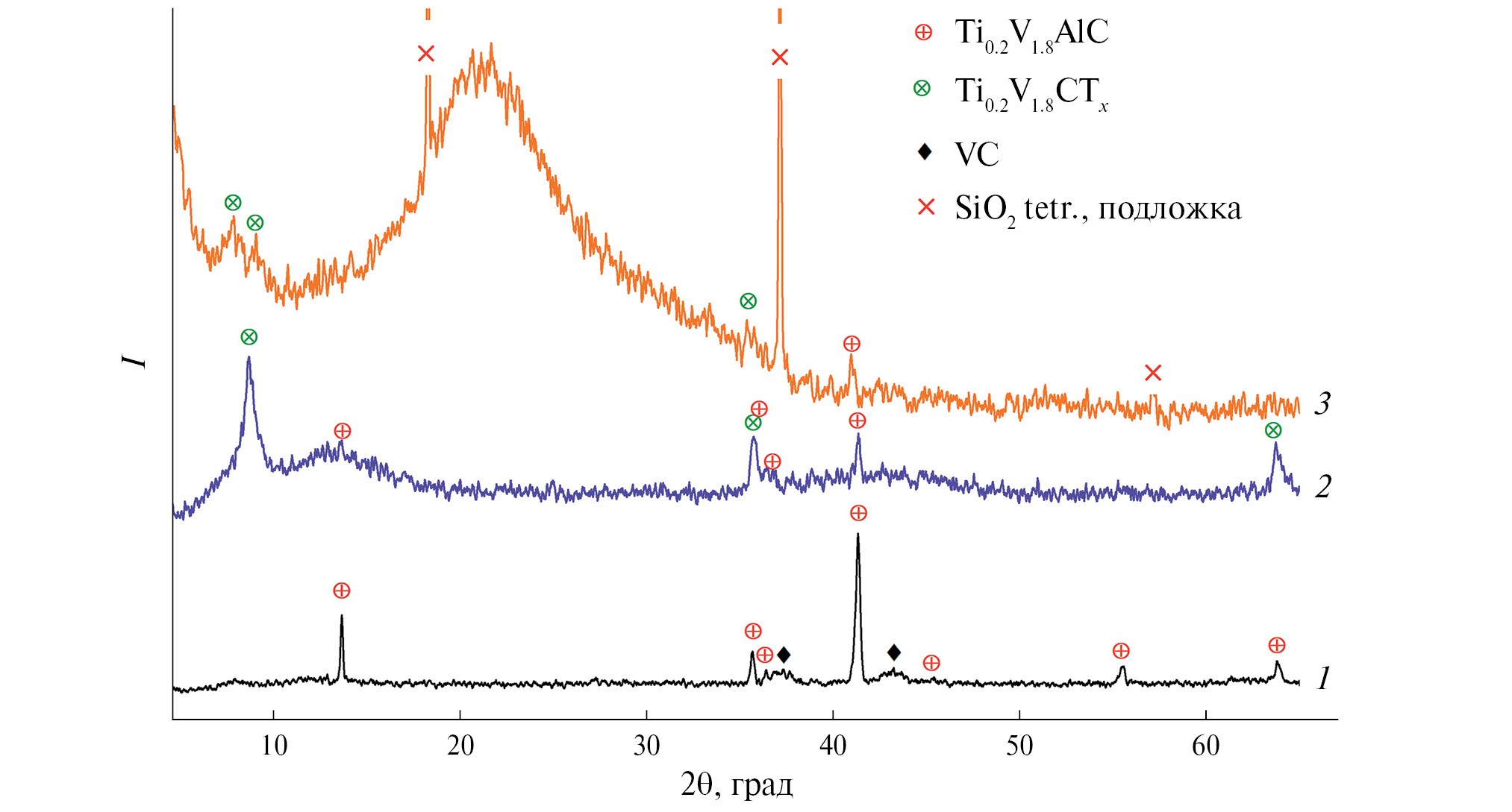 Рис. 2. Рентгенограммы исходной МАХ-фазы Ti0.2V1.8AlC (1), синтезированного многослойного максена Ti0.2V1.8CTx (2) и композиционного материала Ti0.2V1.8CTx–SnO2, полученного в результате гидротермального синтеза (3)