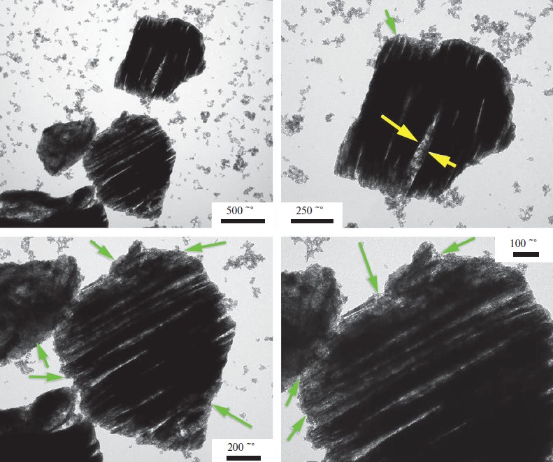 Рис. 3. Микроструктура композиционного наноматериала Ti0.2V1.8CTx–SnO2 по данным ПЭМ; желтыми стрелками обозначено внедрение наночастиц SnO2 между слоями максена, зелеными – их расположение на поверхности аккордеоноподобных агрегатов