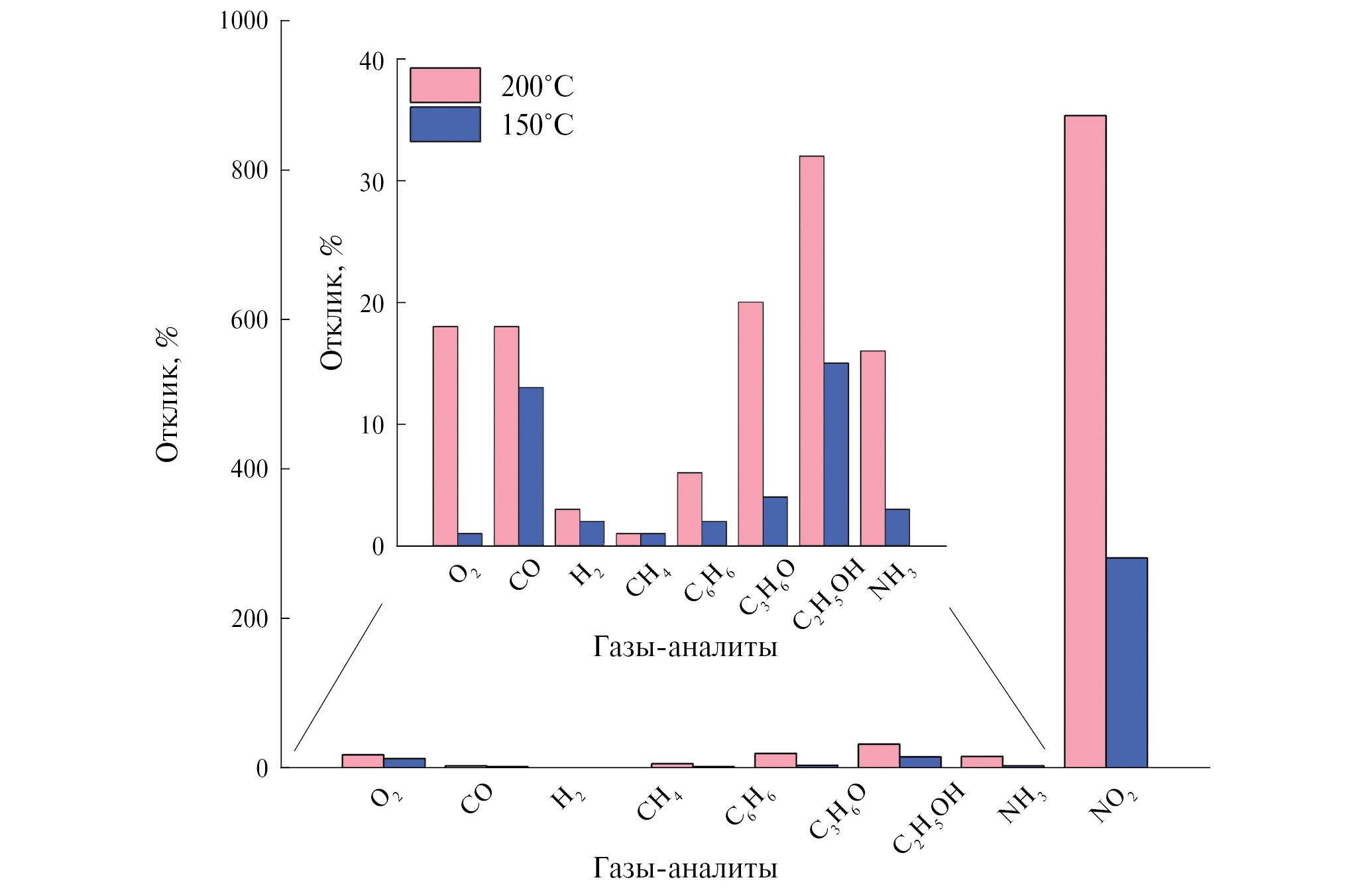 На первом этапе хеморезистивных измерений для полученного композитного слоя Ti0.2V1.8CTx–V2O5–SnO2 комплексно изучена чувствительность к широкой группе газов-аналитов (100 ppm CO, NH3, NO2, C6H6, C3H6O, C2H5OH, 1000 ppm H2, CH4, 10% O2) при рабочих температурах 200 и 150°С. На рис. 5 представлена диаграмма селективности, составленная из откликов на эти газы. Из всех анализируемых газов наибольший отклик наблюдается для NO2 (S = 873 и 281% при рабочих температурах 200 и 150°С соответственно), он значительно превышает отклики на все другие газы. На врезке (рис. 5) представлены отклики на остальные газы. Стоит отметить заметные отклики при температуре детектирования 200°С на О2, СО, этанол, ацетон и аммиак: S = 18, 18, 20, 32 и 16% соответственно. При уменьшении рабочей температуры до 150°С отклики заметно снижаются.