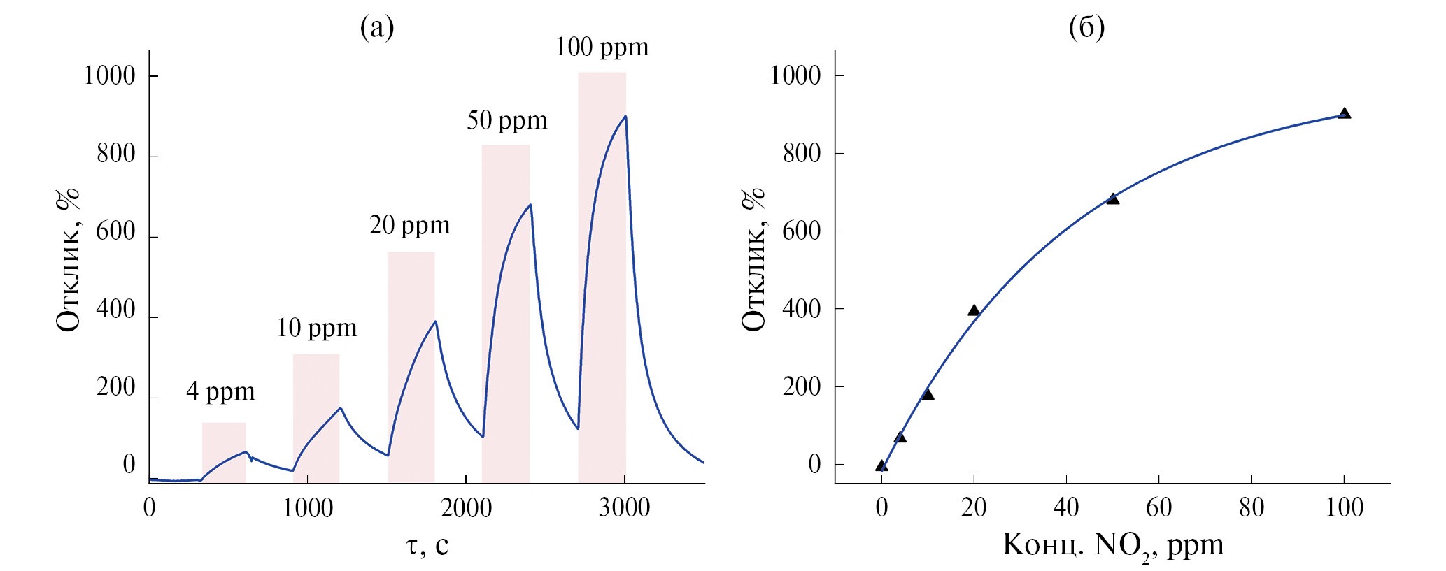 Рис. 6. Отклики композиционного покрытия Ti0.2V1.8CTx–V2O5–SnO2 на 4–100 ppm NO2 (а); зависимость отклика от концентрации NO2 в газовой атмосфере (б); измерения проведены при рабочей температуре 200°C