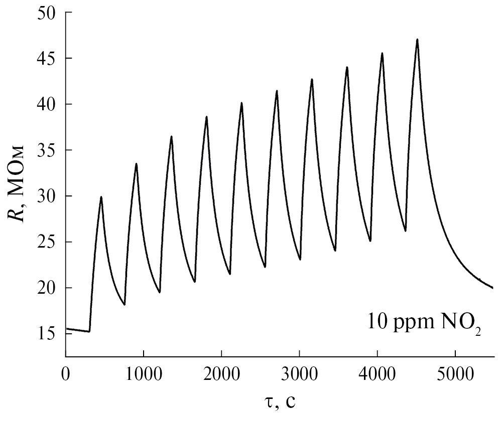 На рис. 7 представлена воспроизводимость сигнала при детектировании 10 ppm NO2. Из рисунка видно, что после нескольких циклов напуска газа в течение короткого времени (150 с на напуск газа) происходит дрейф как значений отклика, так и базовой линии, что может быть связано с необратимой сорбцией NO2 или высоким временем десорбции. С повышением времени восстановления до 500–1000 с сопротивление базовой линии возвращается до начальных значений, что свидетельствует об обратимости поверхностных процессов. Таким образом, данные явления могут свидетельствовать о различной скорости процессов адсорбции и десорбции NO2, что проявляется на экспериментальных графиках в виде дрейфующих значений.