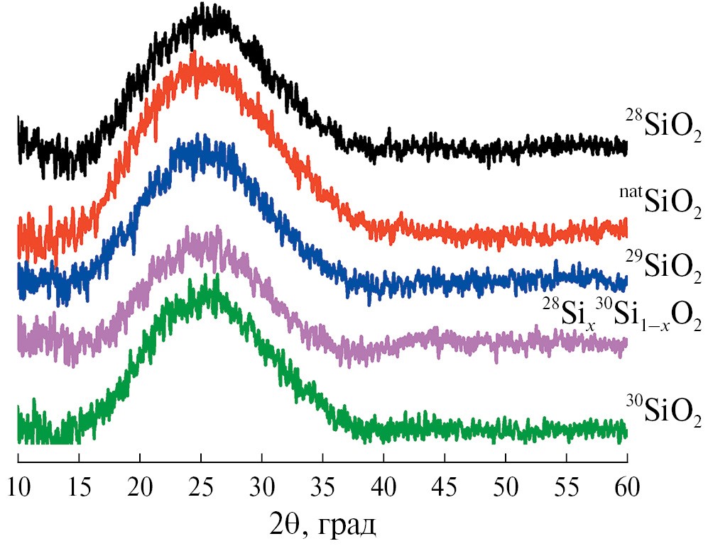 На рис. 1 приведены рентгенограммы аморфного диоксида кремния различного изотопного состава. На рентгенограммах отсутствуют рефлексы отражения кристаллической фазы SiO2, что указывает на рентгеноаморфность полученных образцов. Предел обнаружения составил 2 об. %.