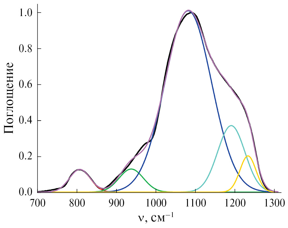 Количество и положение полос пропускания в ИК-спектрах полученных образцов диоксида кремния, приведенных на рис. 3, соответствуют литературным данным [23]. Полосы пропускания в области 1300–950 см–1 относятся к валентным асимметричным колебаниям связей O–Si–О. К валентным симметричным колебаниям связей Si–O–Si относятся полосы в области 900–700 см–1. Ниже 700 см–1 проявляются полосы деформационных колебаний Si–O–Si. После вычитания фона и нормирования полученных спектров (рис. 4) в области валентных колебаний 1360–630 см–1 разложением по Гауссу выделено пять максимумов (рис. 5). Разложение спектра поглощения приведено на примере 28SiO2.