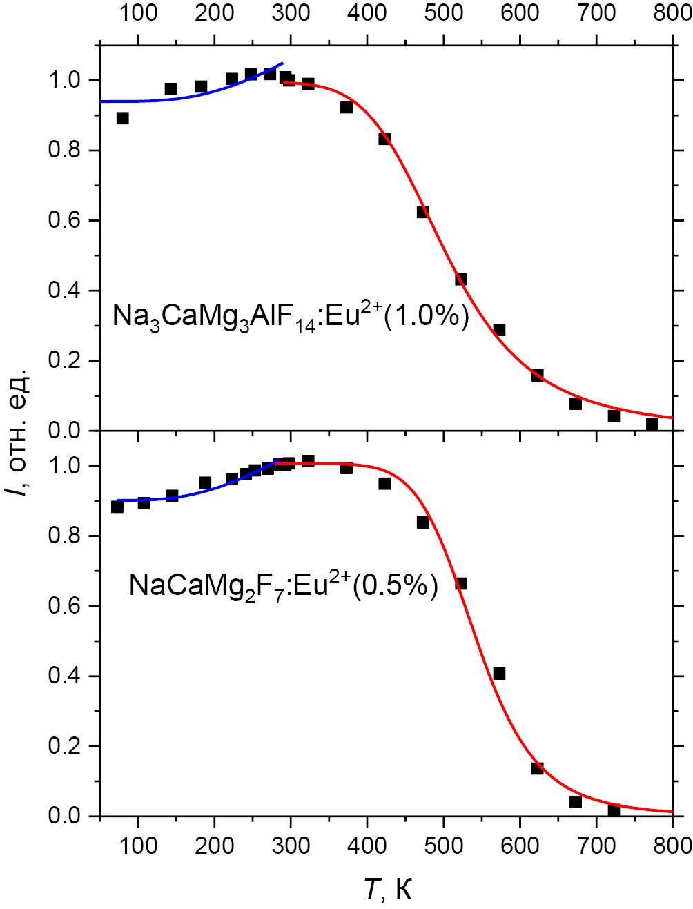 где I0 – интенсивность при Т = 0, ω – “эффективная” (усредненная) частота колебаний решетки. Экспериментальные зависимости интенсивности люминесценции при Т < 295 K хорошо моделируются данной формулой (синие кривые на рис. 5) со значениями энергий фононов ћω, равными 584 (72 мэВ) и 556 см–1 (69 мэВ) для Na3CaMg3AlF14:Eu2+ и NaCaMg2F7:Eu2+ соответственно, что близко к предельной энергии оптических фононов, полученных в [13] для NaCaMg2F7. Сходные температурные зависимости интенсивности люминесценции Eu2+ наблюдаются для многих других люминофоров, легированных Eu2+ (см., например, обзор [18]).