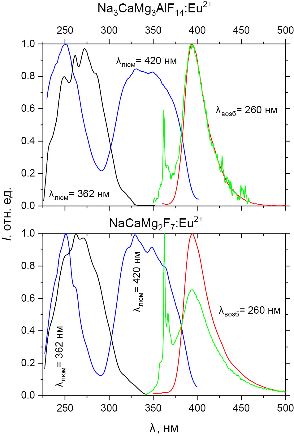 Рис. 7. Спектры ФЛ, измеренные при комнатной температуре в стандартном режиме (красные кривые) и в режиме фосфоресценции (зеленые кривые), при возбуждении на длине волны 260 нм для Na3CaMg3AlF14:Eu2+ (1.0 ат. %) и NaCaMg2F7:Eu2+ (0.5 ат. %). Спектры ВФЛ для 5d–4f-люминесценции (регистрация на длине волны 420 нм, стандартный режим, синие кривые) и для 4f–4f-люминесценции (регистрация на длине волны 362 нм, режим фосфоресценции, черные кривые) ионов Eu2+ в этих керамиках