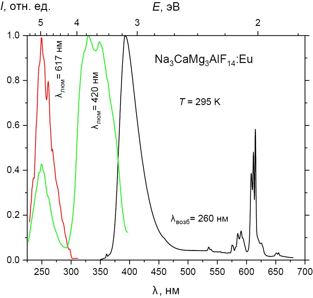 Рис. 9. Спектр ФЛ ионов европия во фториде Na3CaMg3AlF14 после отжига в атмосфере аргона при возбуждении на длине волны 260 нм. Спектры ВФЛ ионов Eu2+ (регистрация на длине волны 420 нм) и Eu3+ (регистрация на длине волны 617 нм) для данной керамики