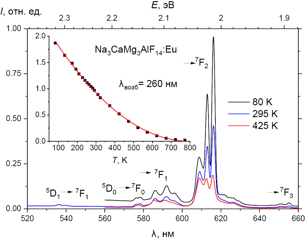 Синтезированные многокомпонентные фториды, легированные Eu2+, демонстрируют хорошую термическую стабильность люминесценции, обусловленной 4f 65d–4f 7-переходами в ионах Eu2+. В частности, температура термического тушения T1/2 люминесценции Na3CaMg3AlF14:Eu2+ (1.0 ат. %) и NaCaMg2F7:Eu2+ (0.5 ат. %) составляет 504 и 543 K соответственно, что может представлять интерес для практического применения люминофоров данного типа в светодиодных источниках света.