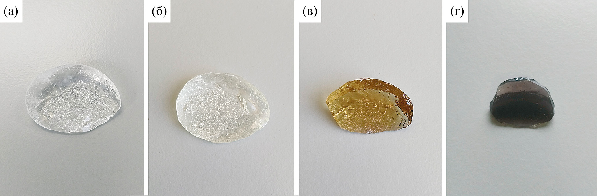 Рис. 2. Фотографии образцов, легированных Bi2O3, мас. %: 5 (а), 10 (б), 20 (в), 40 (г)