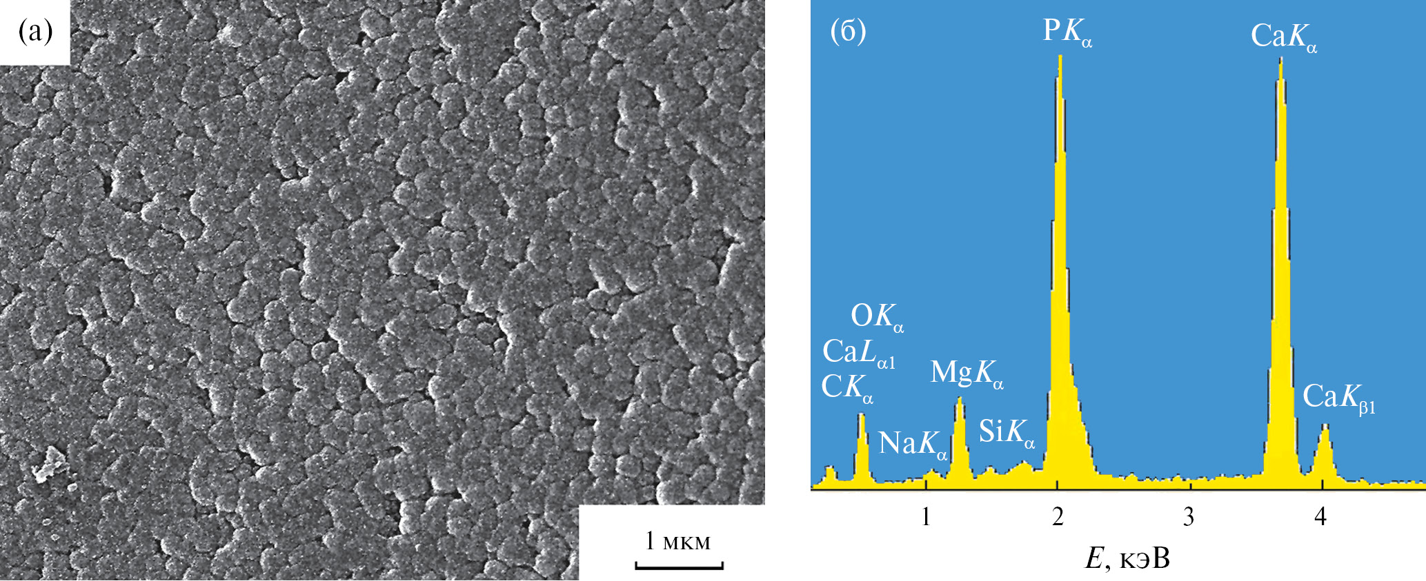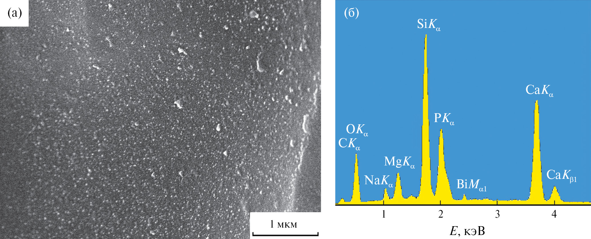 Рис. 4. Микрофотография (а) и энергодисперсионный спектр (б) стекла, содержащего 5 мас. % Bi2O3, после пребывания в SBF-растворе в течение 7 сут