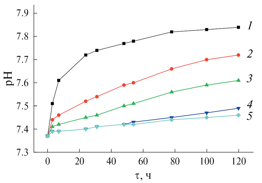 Введение материала в организм не должно приводить к хронической воспалительной реакции в зоне имплантации. В норме плазма крови и межклеточная жидкость организма имеют значения pH 7.37–7.44. Ткани чувствительны к колебаниям показателя pH за пределами этого диапазона. Сдвиг может привести к нежелательным последствиям или патологии – денатурации белков и разрушению клеток. Поэтому кислотно-щелочной баланс организмом жестко регулируется [21]. Воспалительный процесс – защитная реакция организма на увеличение pH в зоне имплантации. Этот процесс снижает pH. Однако, если условия повышенных значений pH сохраняются длительное время или эти значения слишком велики для подавления организмом, может возникнуть хроническая воспалительная реакция, приводящая к обширному разрушению тканей. In vitro проведено исследование изменения pH модельной среды трис-HCl с уровнем рН 7.37 в зависимости от времени нахождения измельченных образцов в растворе. Результаты представлены на рис. 7.