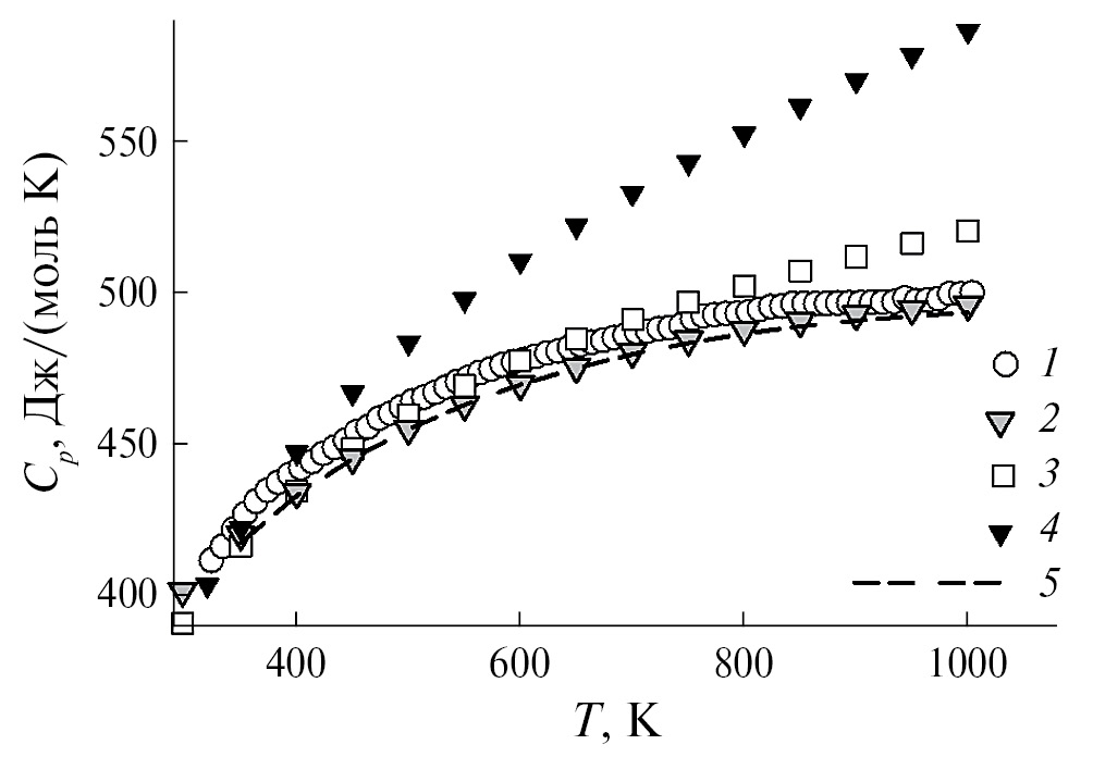 Рис. 1. Влияние температуры на молярную теплоемкость Ca3Y2Ge3O12: 1 – эксперимент, 2 – расчет НК2, 3 – расчет НК1, 4 – расчет методом групповых вкладов, 5 – расчет НК3