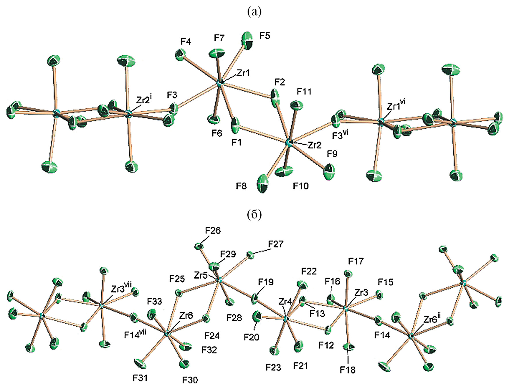 Известно, что центральный атом в комплексных фторидах циркония имеет координационное число (КЧ) 6, 7 или 8. Объединение координационных полиэдров друг с другом в структурах фторидоцирконатов может осуществляться по вершинам, ребрам и граням, приводя к образованию олигомерных, цепочечных, слоистых и каркасных структур [13].