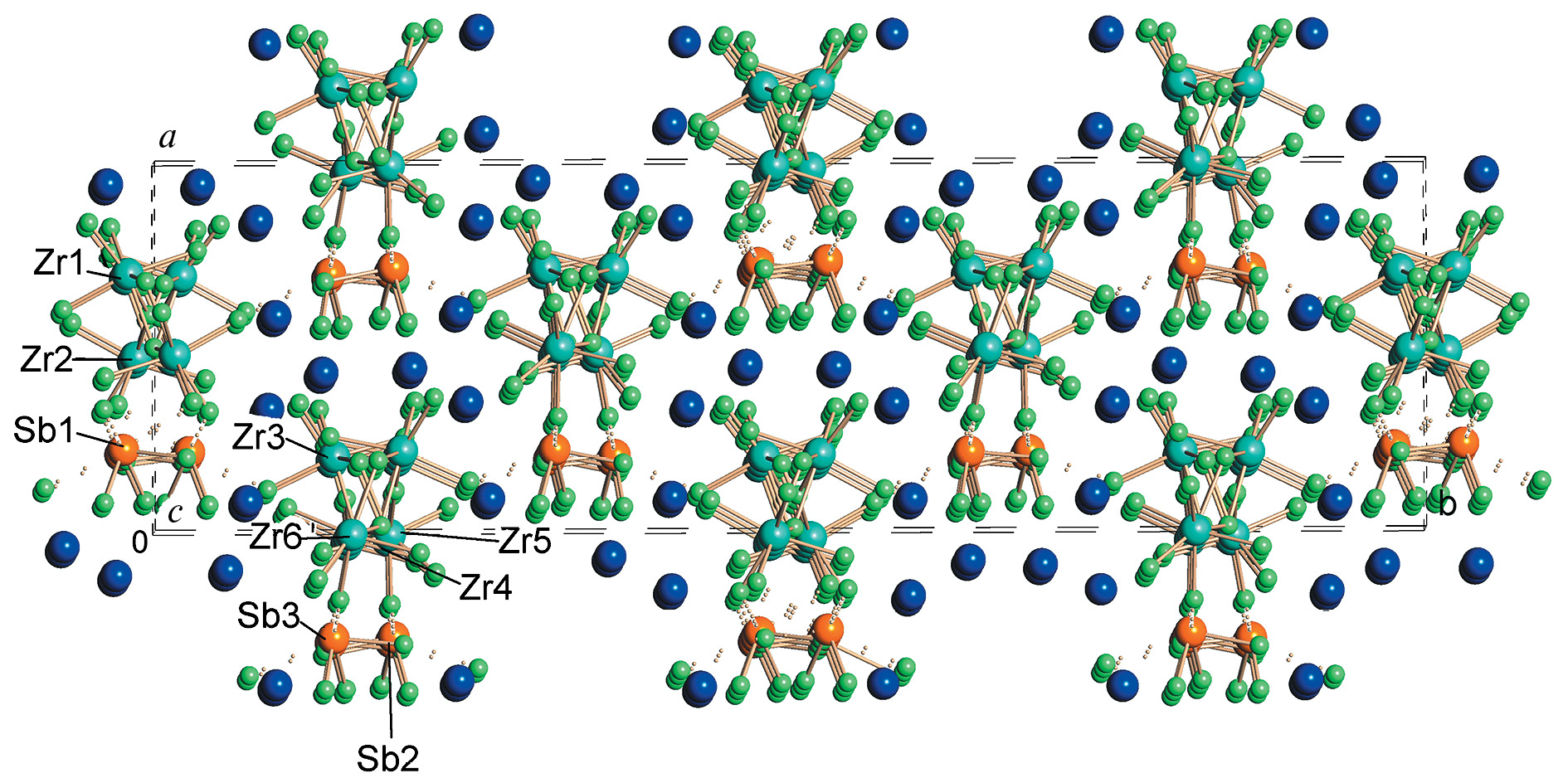 4. Fig. 3. Fragment of the zirconium-antimonium framework in structure II (the bonds of the second coordination sphere of Sb atoms are shown as dotted lines)