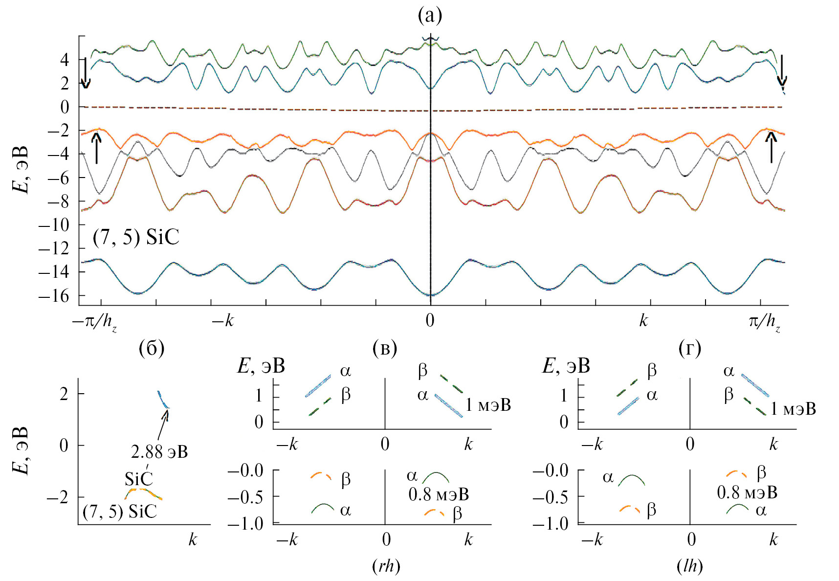 Начнем обсуждение с результатов расчетов хиральной трубки (7, 5). На рис. 2а показан общий вид электронных дисперсионных кривых этой трубки для положительных и отрицательных значений волнового вектора k. В выбранном масштабе энергий спин-орбитальные расщепления уровней неразличимы и представленные дисперсионные кривые выглядят совпадающими для правовинтовой (rh) и левовинтовой (lh) трубок (7, 5). Благодаря полному учету симметрии трубок, сводящему элементарную ячейку к двум атомам с восемью валентными электронами, зонная структура нанотрубки представляется в виде четырех дважды заполненных дисперсионных кривых валентной зоны, отделенных запрещенной зоной от состояний зоны проводимости. В пренебрежении спин-орбитальными эффектами энергия электронов не меняется при изменении знака волнового вектора E(k) = E(‒k). Стрелками показано положение краев зоны проводимости и валентной зоны. Минимальная щель в запрещенной зоне соответствует переходам с энергией 2.88 эВ вблизи противоположных краев зоны Бриллюэна (рис. 2б). Ширина валентной зоны равна 14.5 эВ и включает внутреннюю зону смешанных 3s(Si)- и 2s(C)-состояний шириной 3.5 эВ и верхнюю зону шириной 7 эВ, образованную тремя дисперсионными кривыми гибридных состояний 3p(Si) и 2p(C).