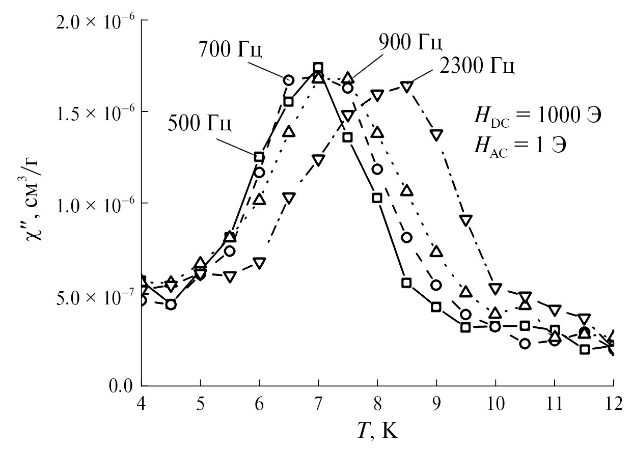 Положение максимума на температурной зависимости χʺ при увеличении частоты переменного магнитного поля смещается в область более высоких температур (рис. 4, 5). Изменение амплитуды модуляции с 1 на 10 Э, как и приложение внешнего магнитного поля напряженностью 1000 Э, не оказывает существенного влияния на вид зависимостей χʺ (рис. S7, S8).