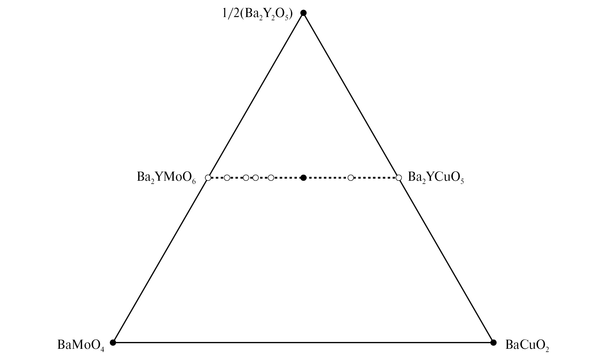 Образцы системы Ba2YMoO6–[Ba2YCuO5] синтезировали методом сжигания геля [14, 15], в качестве исходных реагентов применяли оксид бария BaO (ч., ω(BaO) = 97.2%), карбонат иттрия трехводный Y2(CO3)3 ∙ 3H2O (х. ч., ω(Y2(CO3)3 ∙ 3H2O) = 99.9%), оксид меди CuO (ос. ч., ω(CuO) = 99.997%), оксид молибдена MoO3 (ч. д. а., ω(MoO3) = 99.0%) и восстановитель (органическое топливо) – поливиниловый спирт (16/1, CAS: 9002-89-5). Оксиды металлов и карбонат иттрия, взятые в соответствующих стехиометрических количествах, растворяли в разбавленной азотной кислоте (HNO3 : H2O = 1 : 1 (об.)), раствор упаривали, переносили в керамическую чашку и добавляли порошкообразный поливиниловый спирт. При дальнейшем упаривании раствора наблюдали образование геля. После кратковременного возгорания гель превращался в серо-черный порошок, который перетирали, переносили в керамический тигель, отжигали при 1000°C в течение 3 ч и охлаждали в инерционно-термическом режиме, не вынимая из печи. Температура и время отжига были выбраны на основе предварительных экспериментов, исходя из возможности потери MoO3 при более высоких температурах и более продолжительном времени отжига. Средний размер поликристаллов находился на уровне 50–100 нм, что на порядок меньше частиц Ba2YMoO6, образующихся при твердофазном синтезе [4]. Исследованные составы отмечены в концентрационном треугольнике системы Ba2Y2O5–BaMoO4–BaCuO2 на рис. 1.