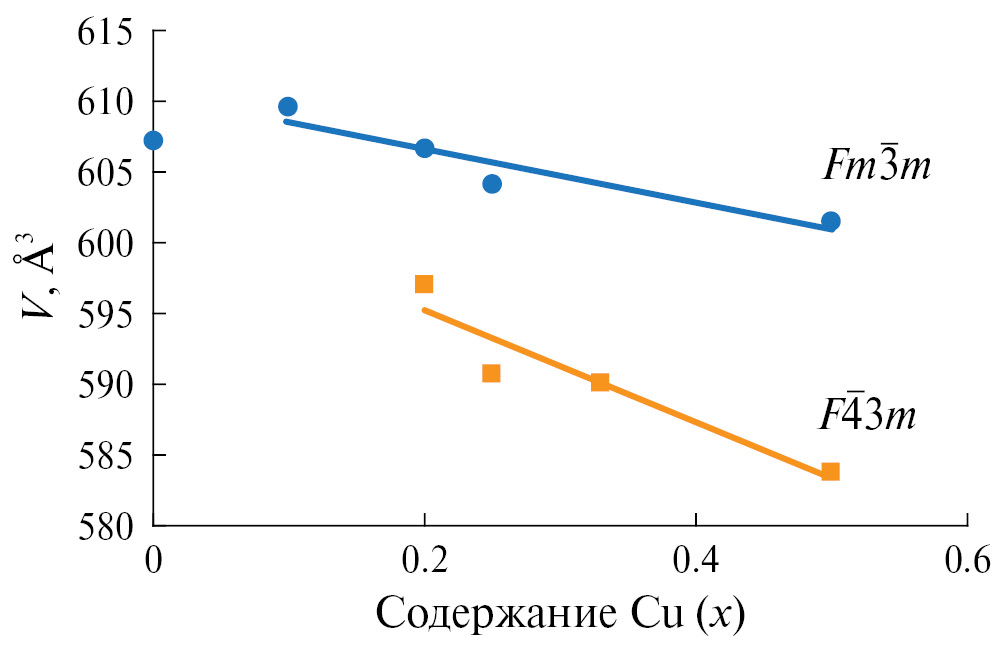 Рис. 3. Зависимость объема элементарной ячейки фаз Fmm и F3m от содержания меди (х) в образцах Ba2YMo1–xCuxO6–δ (0 ≤ x ≤ 0.5).