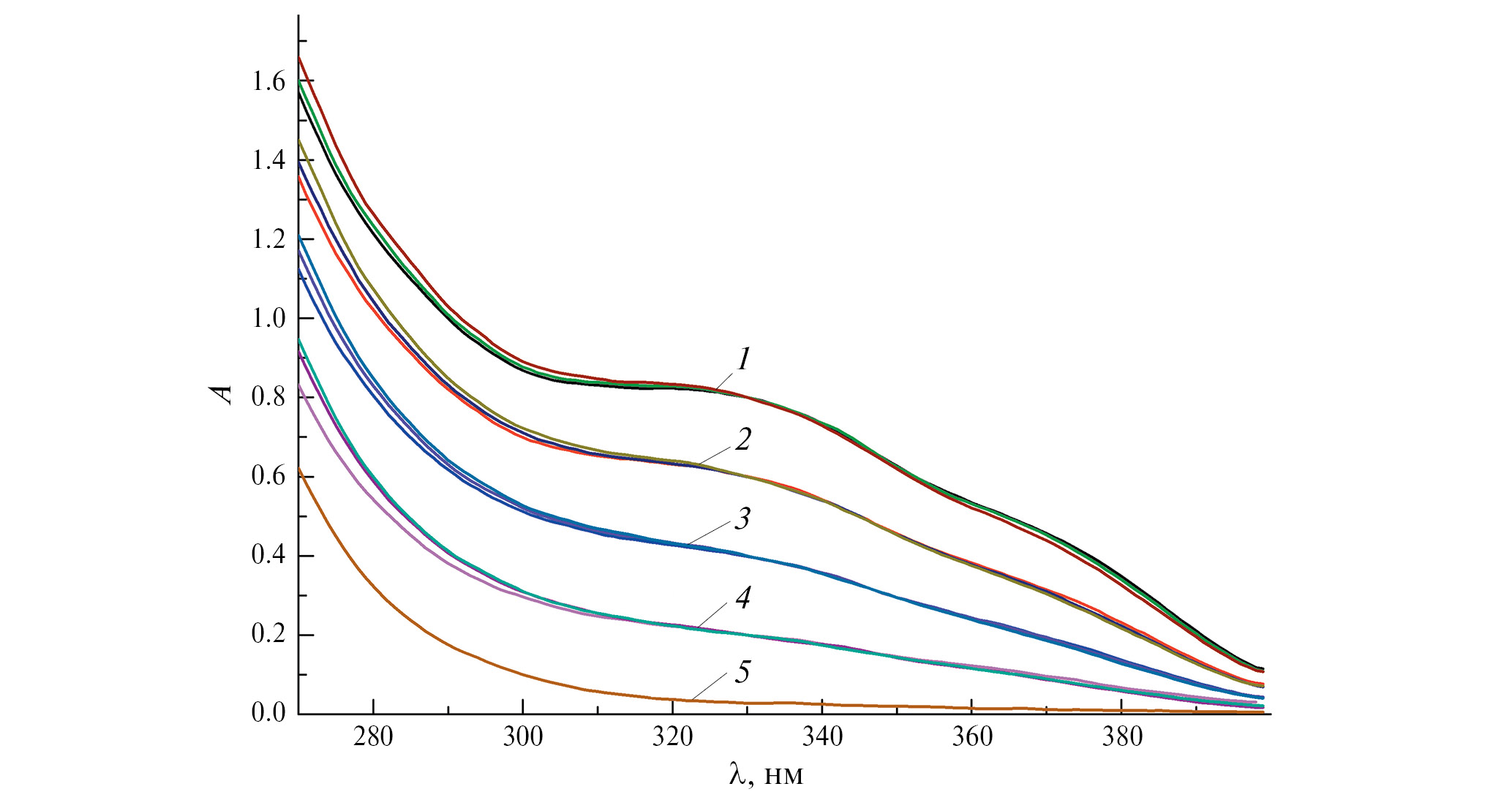 Рис. 2. Спектры растворов, имеющих разный pH (6.66, 6.36, 6.06), но одинаковое поглощение A330 при λ = 330 нм. A330 = 0.800 (1), 0.600 (2), 0.400 (3), 0.200 (4). 5 – спектр Au(GS)2* (CAu = 5.0 × 10–4 M); l = 1 см. При λ < 310 нм различие нарастает из-за разного количества Au(GS)2*.