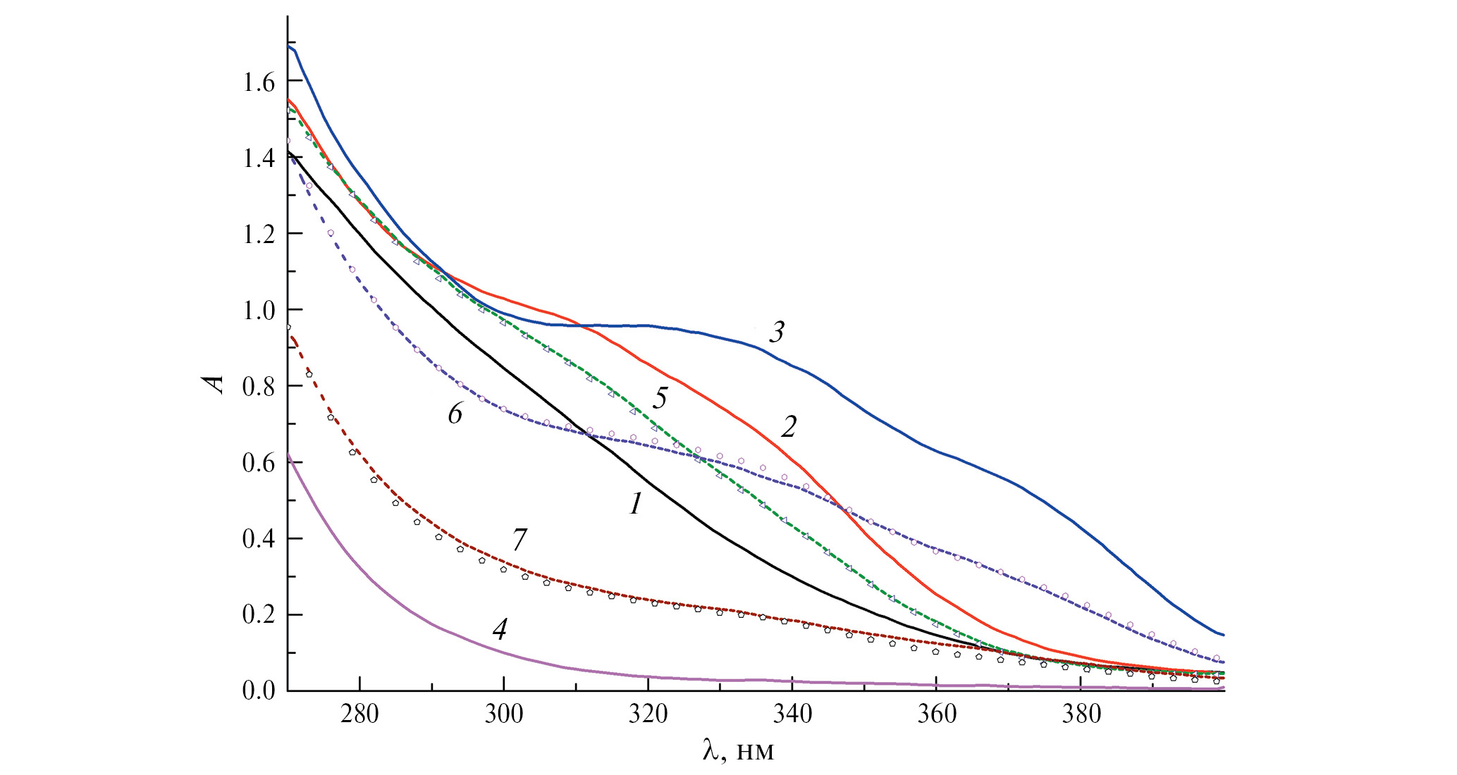 Рис. 3. Примеры разложений спектров, pH 7.20. Базисные спектры (CAu (10–4 M), X): 7.0, 0.50 (1); 6.7, 0.84 (2); 6.4, 1.19 (3); 4 – спектр Au(GS)2* (5.0 × 10–4 M). Разлагаемые спектры (значки – расчет): 6.75, 0.75 (5); 6.11, 1.53 (6); 5.79, 2.0 (7). X = CGS/CAu. l = 1 см.