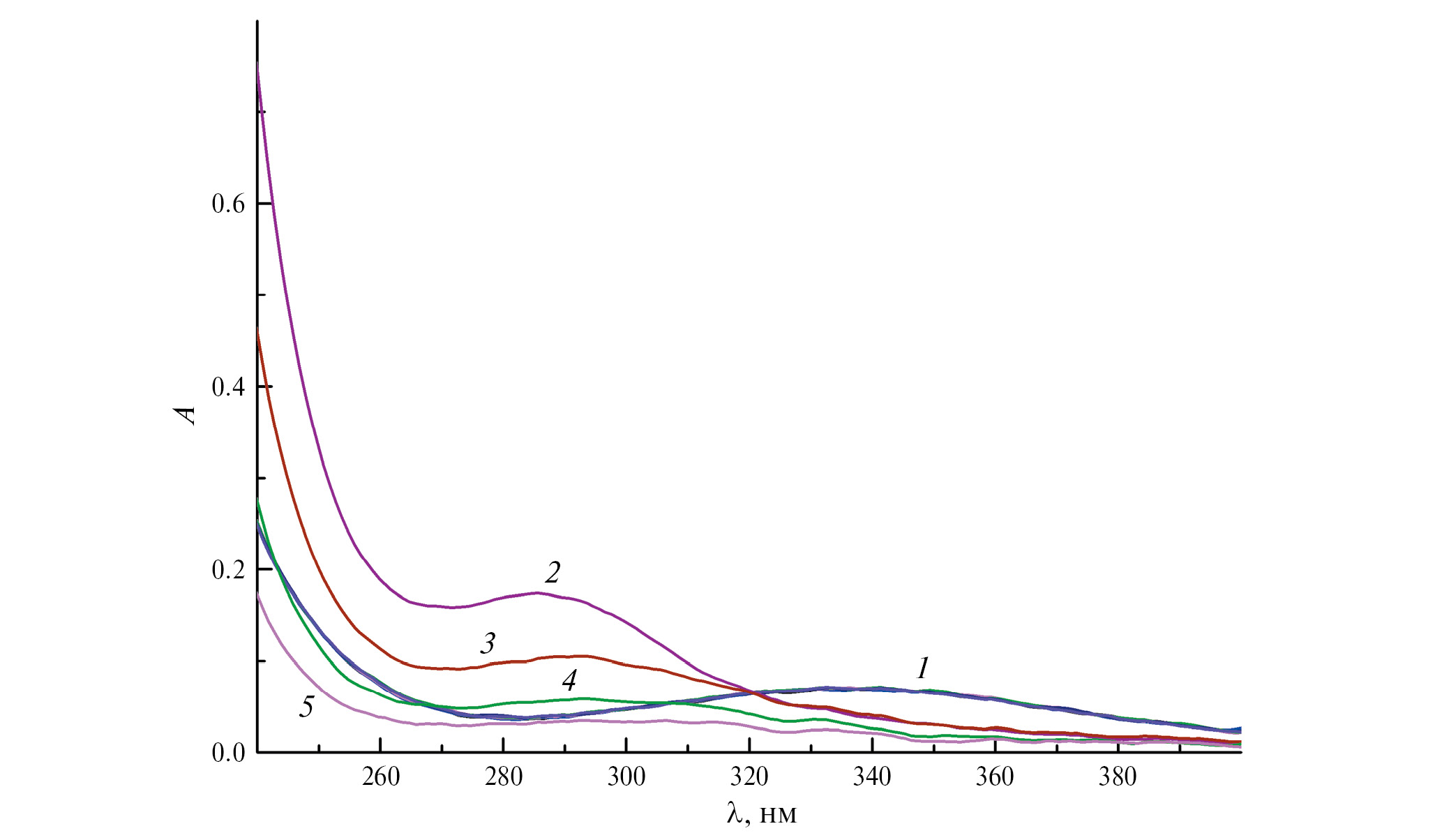 Рис. 4. Изменение во времени УФ-спектра раствора при взаимодействии Au(en)2* с HMet. CAu = 1.0 × 10–4 моль/л, CHMet = 5.0 × 10–4 моль/л; τ = 7 c – 20 мин (1); pH 7.4, l = 1 см. Добавление к раствору HCl до CHCl = 1.6 моль/л, τ = 8 с (2), 5 (3), 10 (4), 15 мин (5).