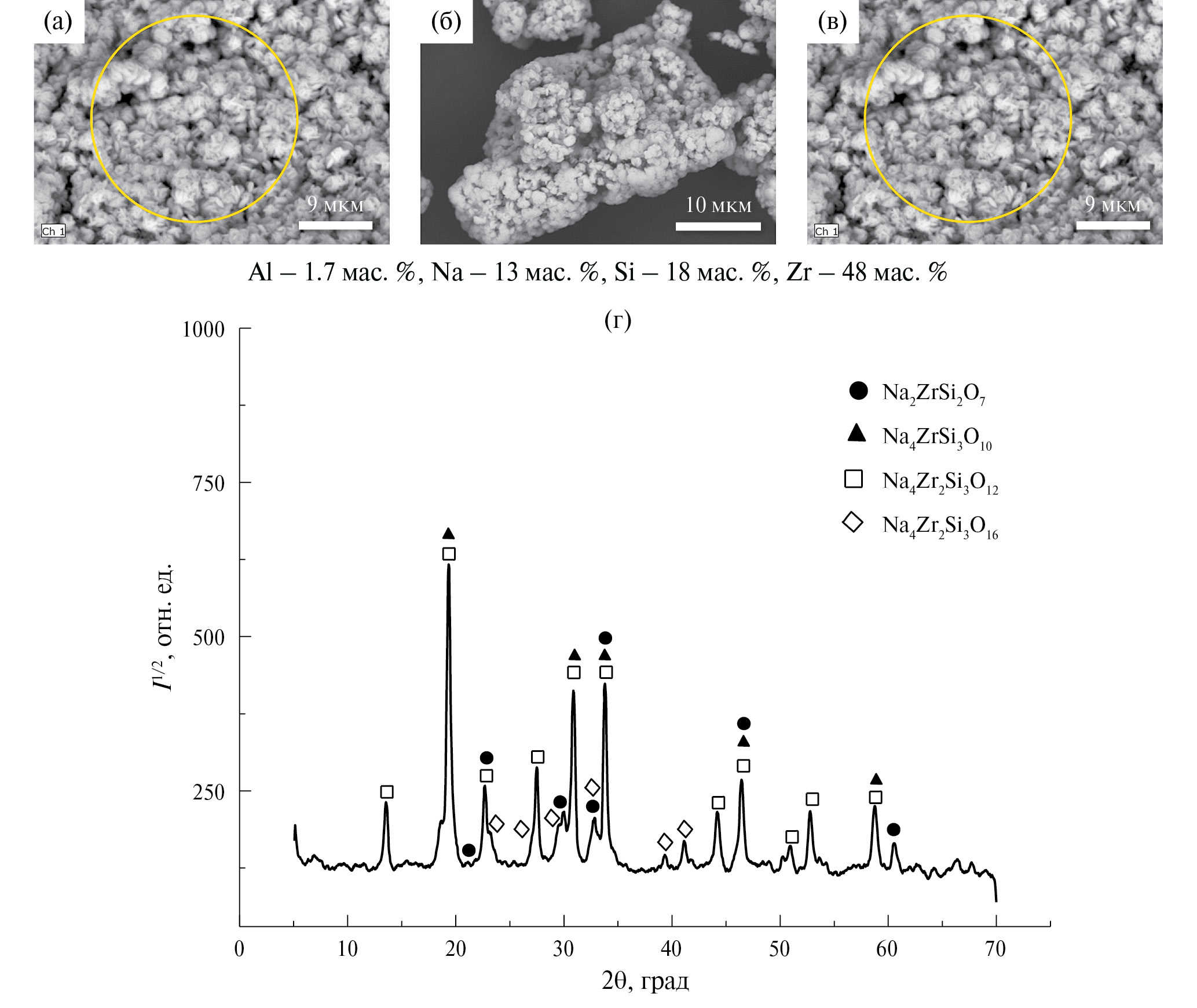 Рис. 4. РЭМ-снимки (а, б) и дифрактограмма (г) продуктов гидротермального синтеза в системе ZrOCl2–NaOH–H2O–(H, Na)X; участок поверхности гранул продуктов по данным ЭДС (в).