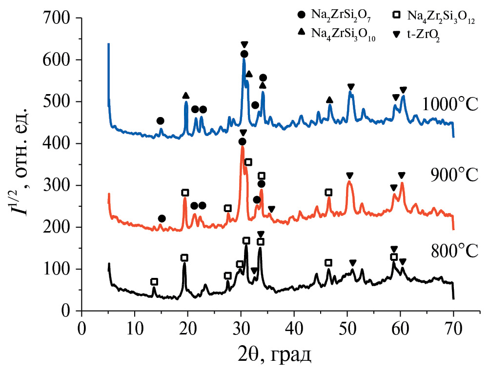 На рис. 10 представлены дифрактограммы керамики, полученной при различных температурах. По данным РФА, образцы, полученные при 800–900°С, представляют собой смесь фаз цирконосиликатов натрия, основными из которых являются гексагональный цирконосиликат Na4Zr2Si3O12 (пр. гр. Rc, ICDD 04-010-3836) и триклинный паракелдышит Na2ZrSi2O7 (пр. гр. P, ICDD 00-39-209), а также тетрагональный (P42/nmc, ICDD 01-79-1771) и орторомбический (пр. гр. Pnam, ICDD 04-013-3123) диоксид циркония ZrO2. В образце, полученном при 1000°С, помимо вышеуказанных фаз присутствует также фаза Na4ZrSi3O10 (монокл., пр. гр. C2/c, ICDD 37-405).