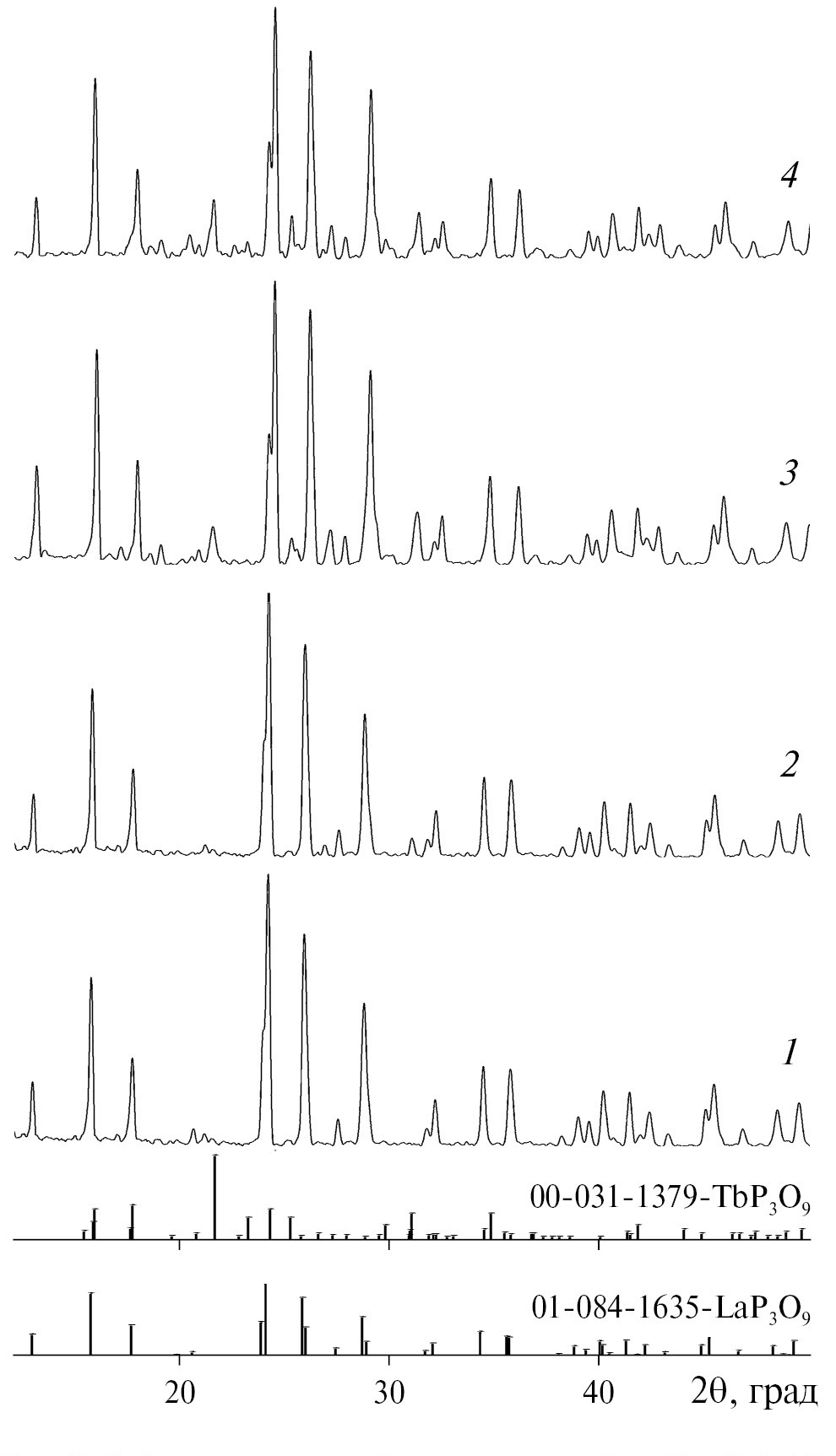 Рис. 2. Дифрактограммы образцов состава La0.9Tb0.1P3O9 (1), La0.8Tb02P3O9 (2), La0.7Tb0.3P3O9 (3), La0.6Tb0.4P3O9 (4).