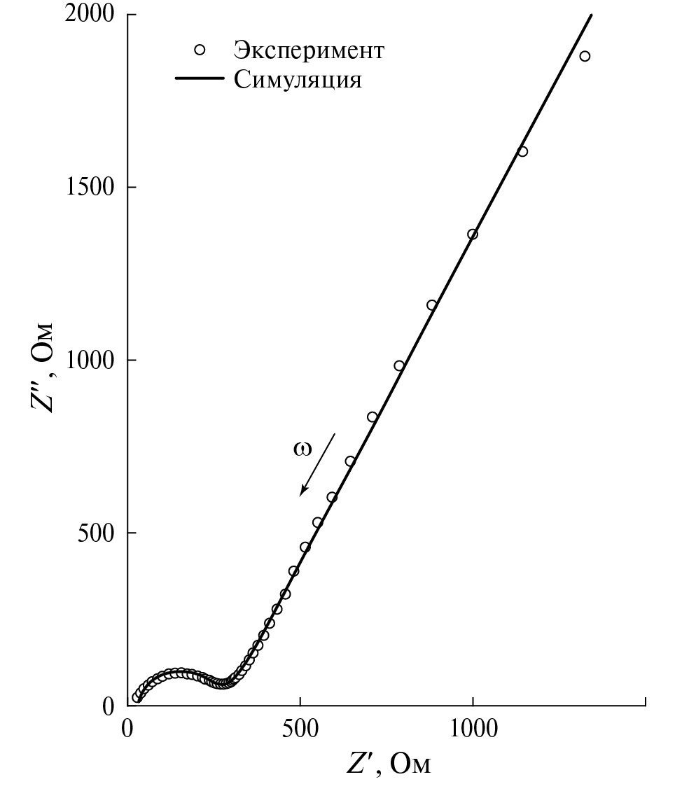В высокочастотной области спектра годографы импеданса имеют вид искаженной полуокружности с центром, расположенным ниже оси абсцисс (рис. 5, 6), что обусловлено параллельным RC-соединением. Искаженная полуокружность может быть смоделирована различными схемами замещения [33–35]. Выбрана схема, показанная на рис. 7, так как она наиболее точно отражает физическую природу процессов и удовлетворительно моделирует экспериментальные годографы. Данную схему замещения применяли для описания спектра импеданса литиевого электрода в исследованиях [36, 37]. Выбор схемы с импедансом Варбурга является обоснованным для рассматриваемых спектров, поскольку начальная часть высокочастотной области в небольшом интервале линейна, что характерно для диффузионных процессов. Низкочастотная область спектра годографа импеданса в виде наклонной прямой моделируется элементом постоянной фазы (CPE) и связана с возникновением двойного электрического слоя на границе образец–электрод.