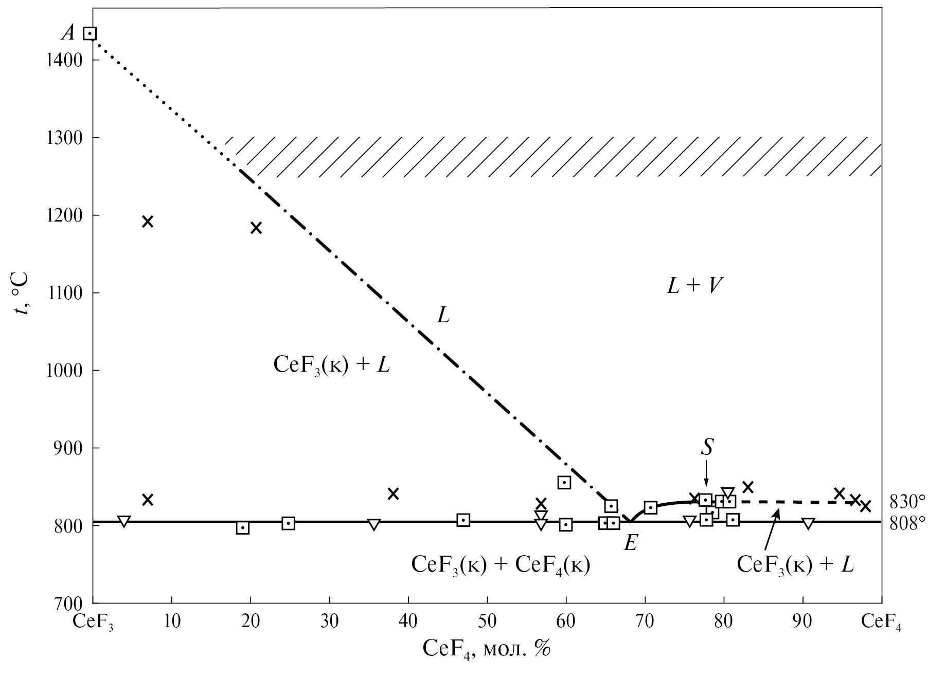 Диаграмма состояния системы CeF3–CeF4, изученная с помощью РФА, визуального и термического анализа, представляет собой простую эвтектику с составом в диапазоне CeF3.66‒CeF3.71 (принято CeF3.68) при температуре 808°C [22] (рис. 1). Существование твердых растворов не обнаружено. Авторы работы [22] не смогли исследовать систему при температурах выше 1200°С, поскольку при этих температурах жидкость становится нестабильной и образует твердый трифторид церия, газообразные фтор и фториды церия. В отсутствие точно контролируемого давления нельзя было определить температуру начала нестабильности, поэтому авторами на рисунке была проведена широкая заштрихованная полоса.
