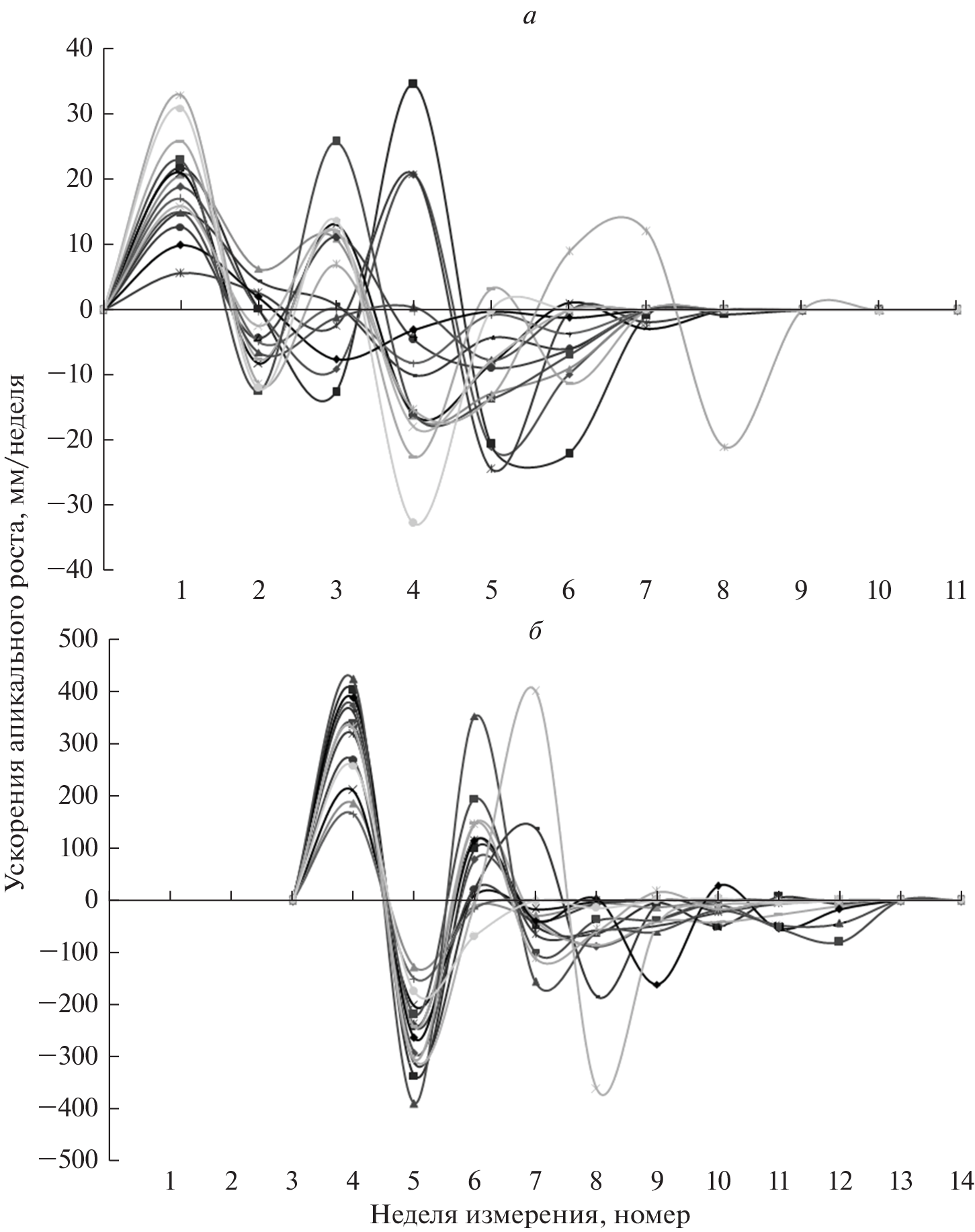 The aim of the study was to establish the type (linear or non-linear) and shape (presence of extremes and trends) of the time dependences of apical and radial growth rates for shoots of two types (branching and formation) in woody plants. The object of the study was an introduced in the Middle Urals ornamental early-flowering shrub species Forsythia ovata Nakai. Seasonal dynamics of morphometric parameters of two types of shoots, which differ in intensity of growth and origin (developing from the apical or dormant buds of the skeletal branch respectively), was examined. Also, there was made an assessment of their relationship with air temperature and precipitation values. Apical and radial growth are accompanied by oscillations of increments. The duration of individual phases of oscillations is about 7 or more days, which makes it possible to attribute this phenomenon to infradian growth rhythms. The weak relationship between the characteristics of the observed oscillations and weather conditions indicates the predominantly endogenous nature of the observed morphogenetic processes. The growth of formation shoots begins 4 weeks later than branching shoots. This delay is apparently related to the time necessary for activation of dormant bud growth. Seasonal dynamics curves of rates and accelerations of the apical and radial shoot’s growth have the shape of previously unobserved oscillations with phases fading in amplitude and changing in duration. The growth ends 1–2 months before the environmental conditions become unfavorable. The oscillations of the growth rate of shoots are apparently associated with the action of two or more differently directed factors, which determine the increase in volume of different segments of the shoot. These factors include the different contribution of cell division and elongation to the change in the geometric dimensions of the apical meristem domains. The main differences in the seasonal dynamics of the apical and radial increments for both types of shoots are: the duration of growth (6–8 and 4 weeks, respectively), the number of extremes, the amplitude and the duration of individual phases of oscillations. Higher amplitudes of the growth rate oscillations in shoots formation compared with branching shoots, cause bigger values of the formation shoots total increments. The dynamic curves of the apical growth rates have two maxima, while those of the radial growth have only one. Each type of growth, despite the delay in the onset of the formation shoots, has the same total duration. The shapes of curves of seasonal changes in speeds and accelerations of shoot growth values are also similar for different types of shoots. These similarities indicate that shoots have the same “programs” of growth regulation, ultimately determined by the genotype. The rhythmic growth of both types of shoots during the season suggests the existence of the relationship in time between the rates of division and growth of cells located in functionally different groups of cells in the apical meristem zone.