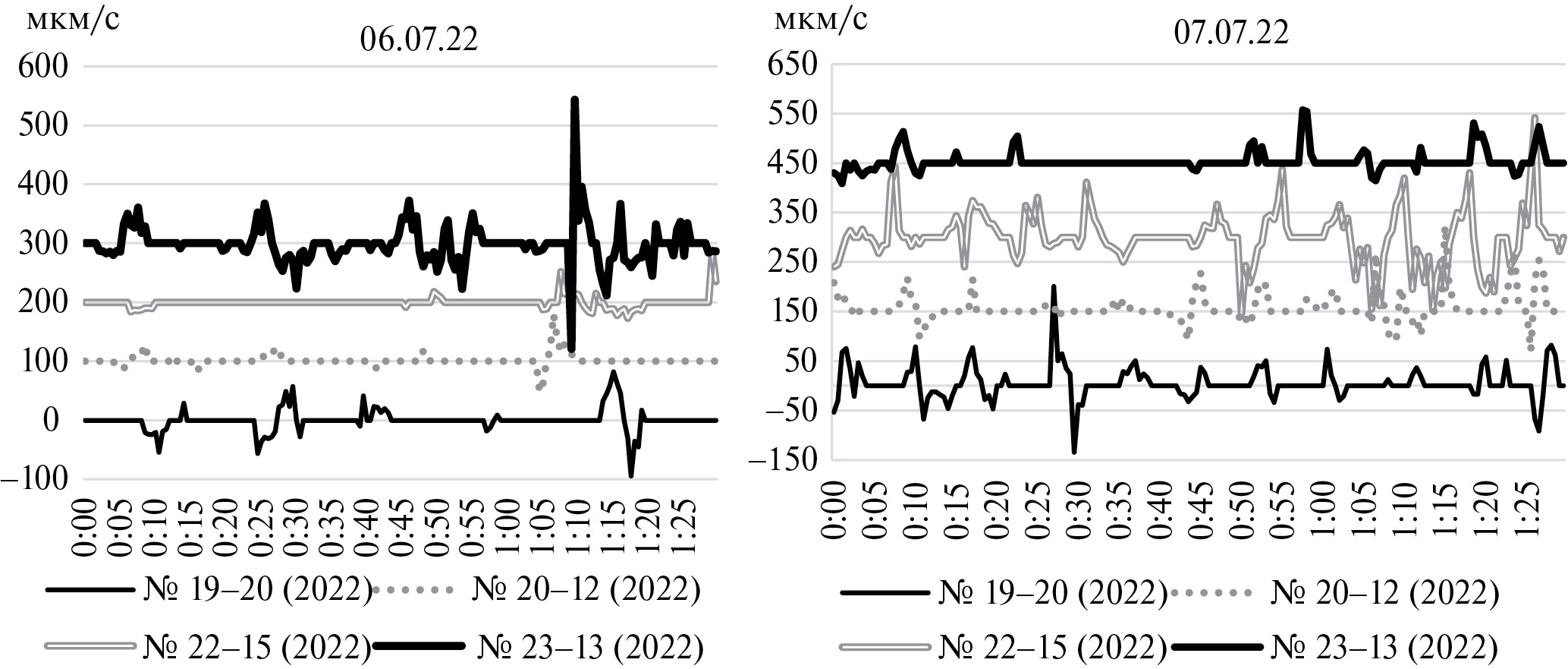 На графиках скорости ГПТ (рис. 3) хорошо различима некая ритмика, периодичность. Эти периоды далеки от идеальных с неизменной продолжительностью между пиками, однако появление мощных ГПТ, отличающихся большой максимальной скоростью, продолжительностью и значительным объемом перенесенной ими гидроплазмы течений, не выглядит хаотичным, а происходит с некоторой периодичностью.