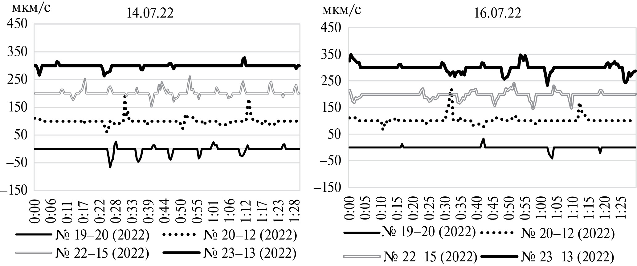 Рис. 8. Динамика скорости гидроплазматических течений у четырех колоний D. pumila на третьи (14.07.22) и пятые сутки (16.07.22) восстановления колоний при температуре морской воды до 16 оC. Продолжительность съемки 1.5 ч каждая. По оси Х время с начала видеорегистрации.