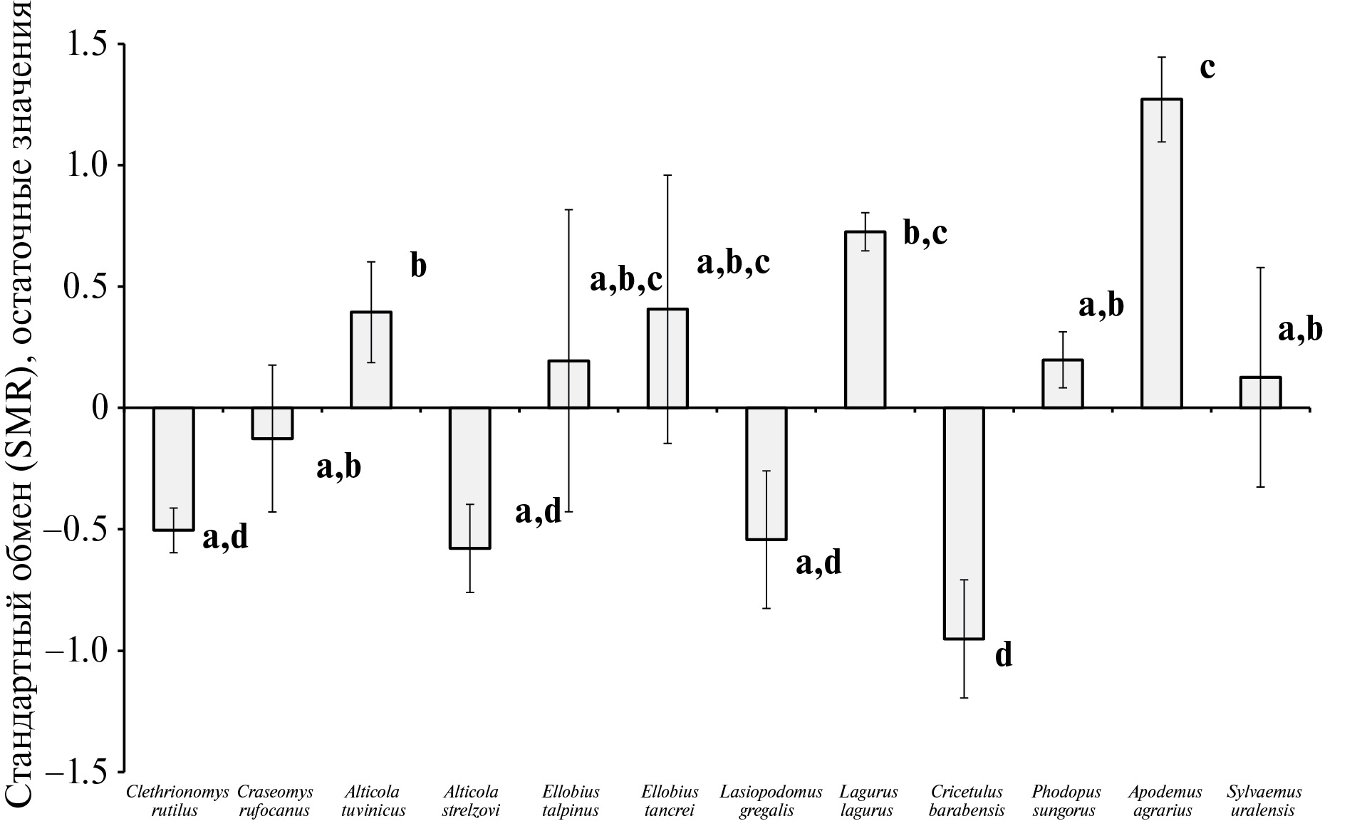 Рис. 1. Остаточные значения стандартного обмена (SMR, среднее ± стандартная ошибка) у 12 видов мышевидных грызунов. Здесь и на рис. 2–4 значения, достоверно различающиеся между собой (Тьюки HSD-тест; P < 0.05), отмечены разными буквами.