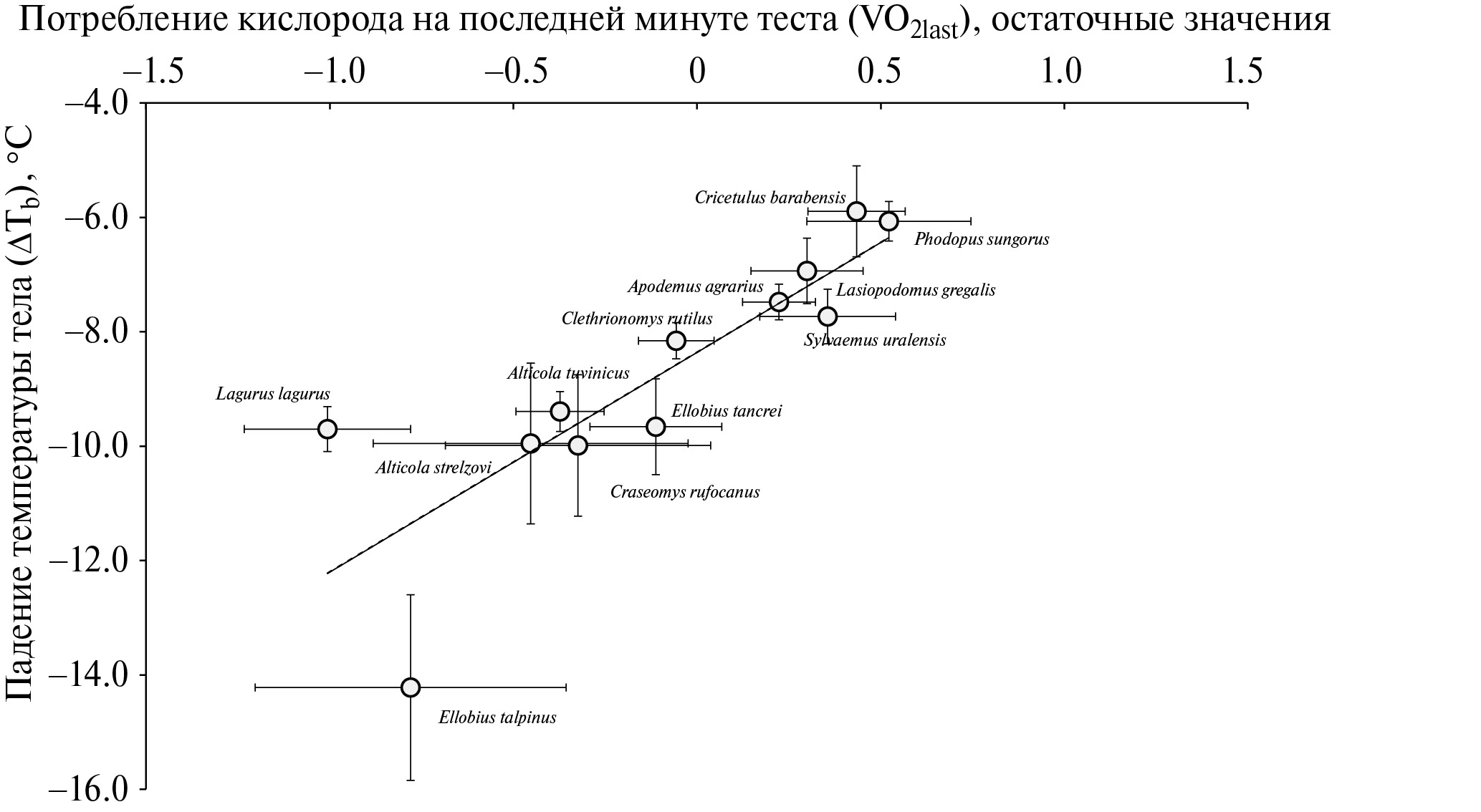 Рис. 6. Зависимость между падением температуры тела и потреблением кислорода на 15-й минуте теста (VO2last) у 12 видов мышевидных грызунов. Приведена аппроксимирующая линия регрессии.