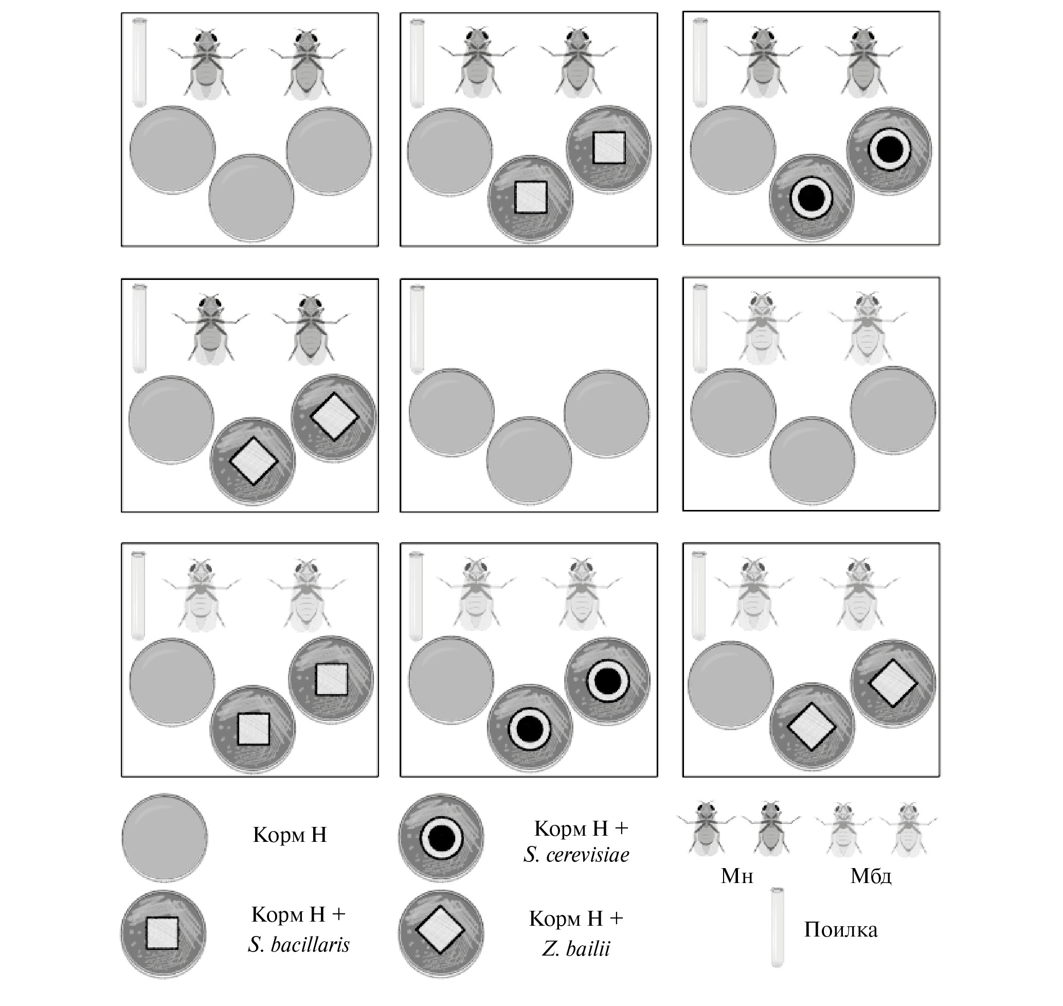 Мух F0, вышедших из куколок в течение трех дней (за это время удавалось накопить достаточное количество мух для тестирования), выпускали в такие же боксы, как и те, в которых ведется эволюционный эксперимент. “Датой рождения” тестируемых мух условно считали второй день трехдневного интервала. Одновременно в боксы выпускали по 115–125 мух. Все тестируемые когорты подготавливали и выпускали в боксы одновременно, это обеспечило синхронное воздействие на них изменений атмосферного давления, влажности, освещенности и других случайных неконтролируемых или частично контролируемых параметров среды. Дизайн эксперимента представлен на рис. 1: в бокс ставили либо по три чашки Петри с кормом Н, либо одну чашку с кормом Н и две чашки с кормом Н, засеянным одним из видов дрожжей. Корм заменяли каждые три дня. Через час после постановки свежего корма в бокс проводили подсчет отложенных яиц. Подсчет умерших мух производили ежедневно вплоть до гибели последней мухи, определяли пол погибших мух. В бокс также помещали поилку – пробирку с водой, закрытую влажной ватой. Для возможности отслеживать случайную контаминацию эксперимента микробиотой извне в тест был включен бокс, содержащий корм Н и поилку, но не содержащий мух (центральный квадрат на рис. 1). С данным боксом проводили те же манипуляции, как и с боксами, в которых содержались мухи.