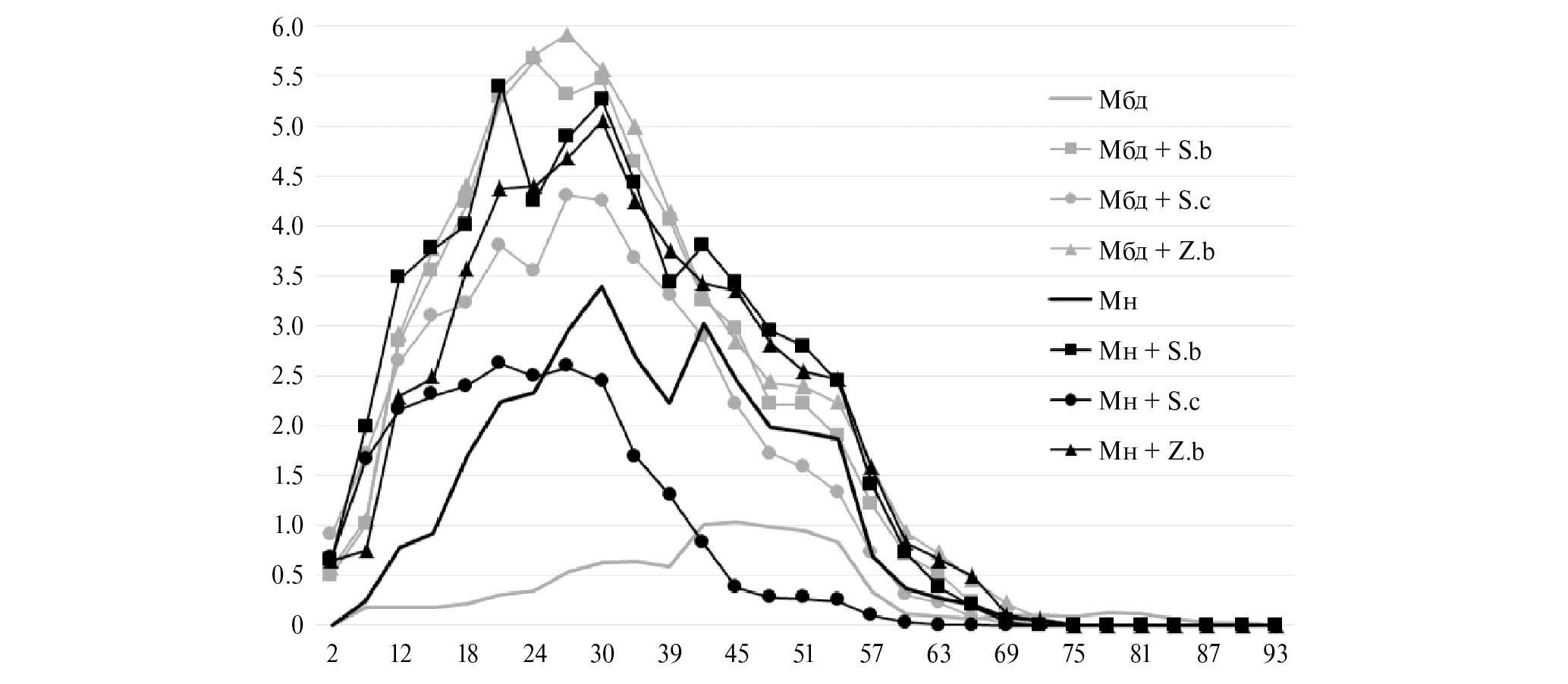 В линии Мбд любой вид подсеянных на корм дрожжей значимо понижает среднюю ПЖ примерно до уровня средней ПЖ контрольных мух (Мн на Н). На корме S.b ПЖ мух Мбд значимо снижается почти на 14 дней, с 78.1 до 64.2 дня (Мбд на S.b по сравнению с Мбд на Н). При этом “добавление” своего естественного микробиома значимо снижает среднюю ПЖ еще почти на 7 дней, с 64.2 до 57.4 дня (Мн на S.b по сравнению с Мбд на S.b, различия статистически значимы). ПЖ мух Мбд на корме с подсевом пекарских дрожжей (S.c) значимо снижается более чем на 15 дней (Мбд на S.c по сравнению с Мбд на Н), а добавление еще и естественного микробиома значимо сокращает жизнь на 7 дней дополнительно (Мн на S.c по сравнению с Мбд на S.c, различия статистически значимы). Средняя ПЖ мух Мбд на корме Z.b значимо снижается примерно на 13 дней (Мбд на Z.b по сравнению с Мбд на Н), а добавление к подсеву дрожжей естественного микробиома мух сокращает жизнь еще примерно на 4 дня, однако различие средней ПЖ не достигает уровня статистической значимости (Мн на Z.b по сравнению с Мбд на Z.b).