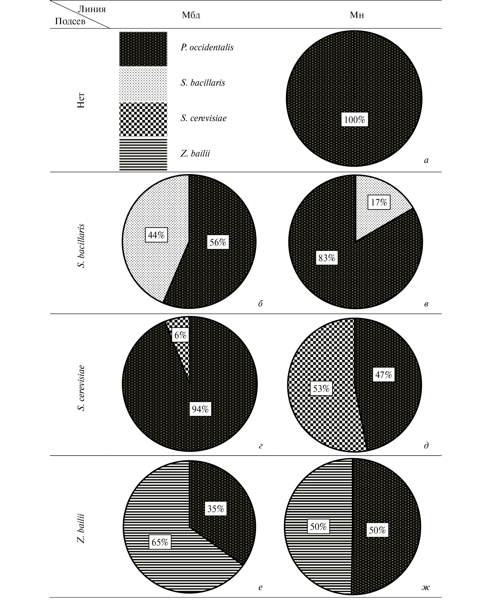 Далее в статье используются обозначения S.b – корм Н, засеянный видом дрожжей S. bacillaris, Z.b – Z. bailii, S.c – S. cerevisiae.