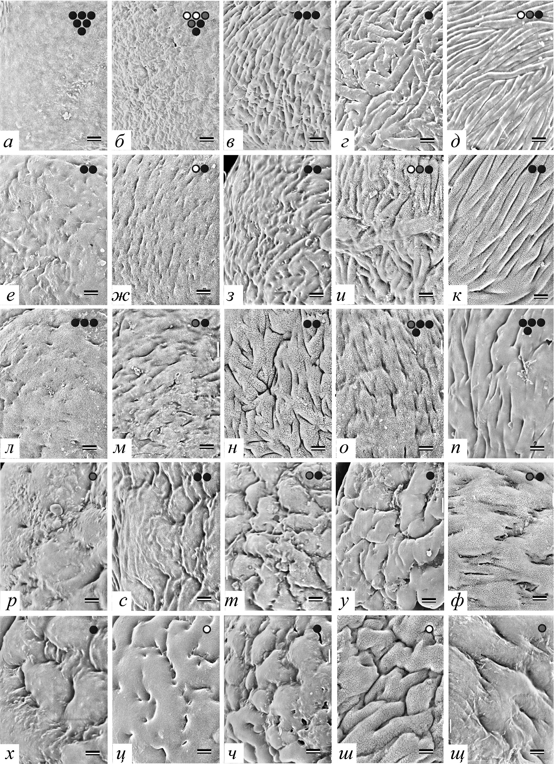 Рис. 4. Изменчивость признаков типичной скульптуры пыльцевых зерен представителей р. Cestrum: а — C. euanthes; б — C. dumetorum; в — C. bigibbosum; г — C. mathewsii; д — C. bracteatum; е — C. microphyllum; ж — C. discolor; з — C. hartwegii; и — C. roseum; к — C. subpulverulentum; л — C. viride; м — C. anagyris; н — C. psittacinum; о — C. thyrsoideum; п — C. diurnum; р — C. laxum; с — C. parqui; т — C. conglomeratum; у — C. jaegeri; ф — C. rigidum; х — C. strigillatum; ц — C. nocturnum; ч — C. hirtum; ш — C. elegans; щ — C. laurifolium. Точками в правом верхнем углу кадра обозначено число видов со схожей скульптурой: белые — секция Habrothamnus, черные — секция Eucestrum (Francey, 1935, 1936), серые — секция неизвестна. Масштабная линейка — 1 мкм.