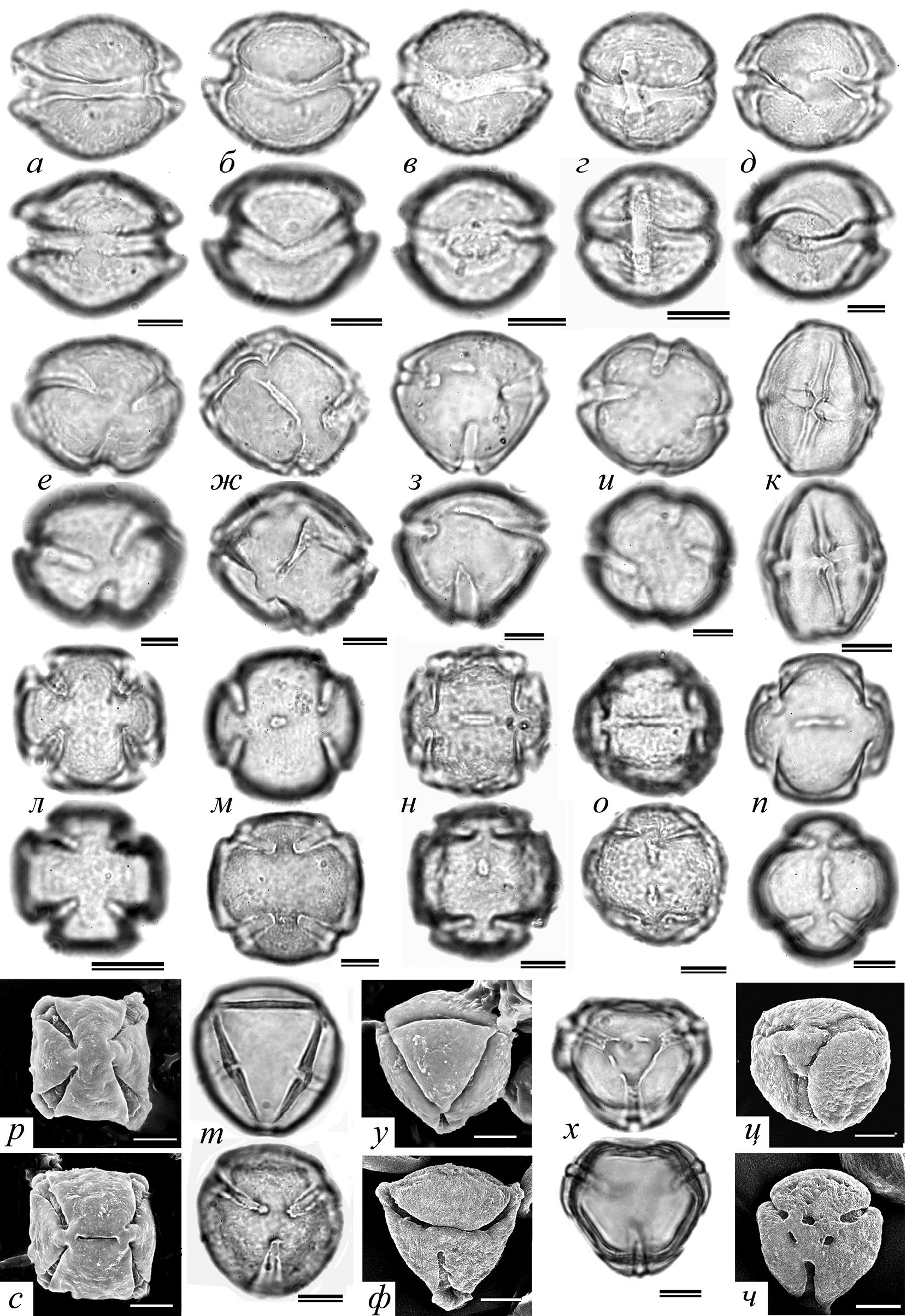 а — форма А; б — форма В; в, г — форма С (одно и то же пыльцевое зерно в двух разных проекциях); е–з — форма Е; и–л, р — форма G; м, н — форма H; о — форма I; п, с, т, у — форма J; ф–ч — форма К. Буквенные обозначения форм см. на рис. 6. Для каждого пыльцевого зерна (CМ) показан верхний и нижний фокус. Масштабная линейка — 1 мкм.