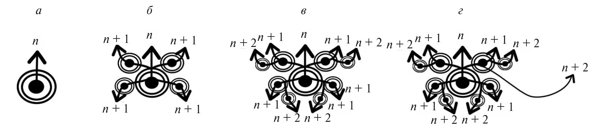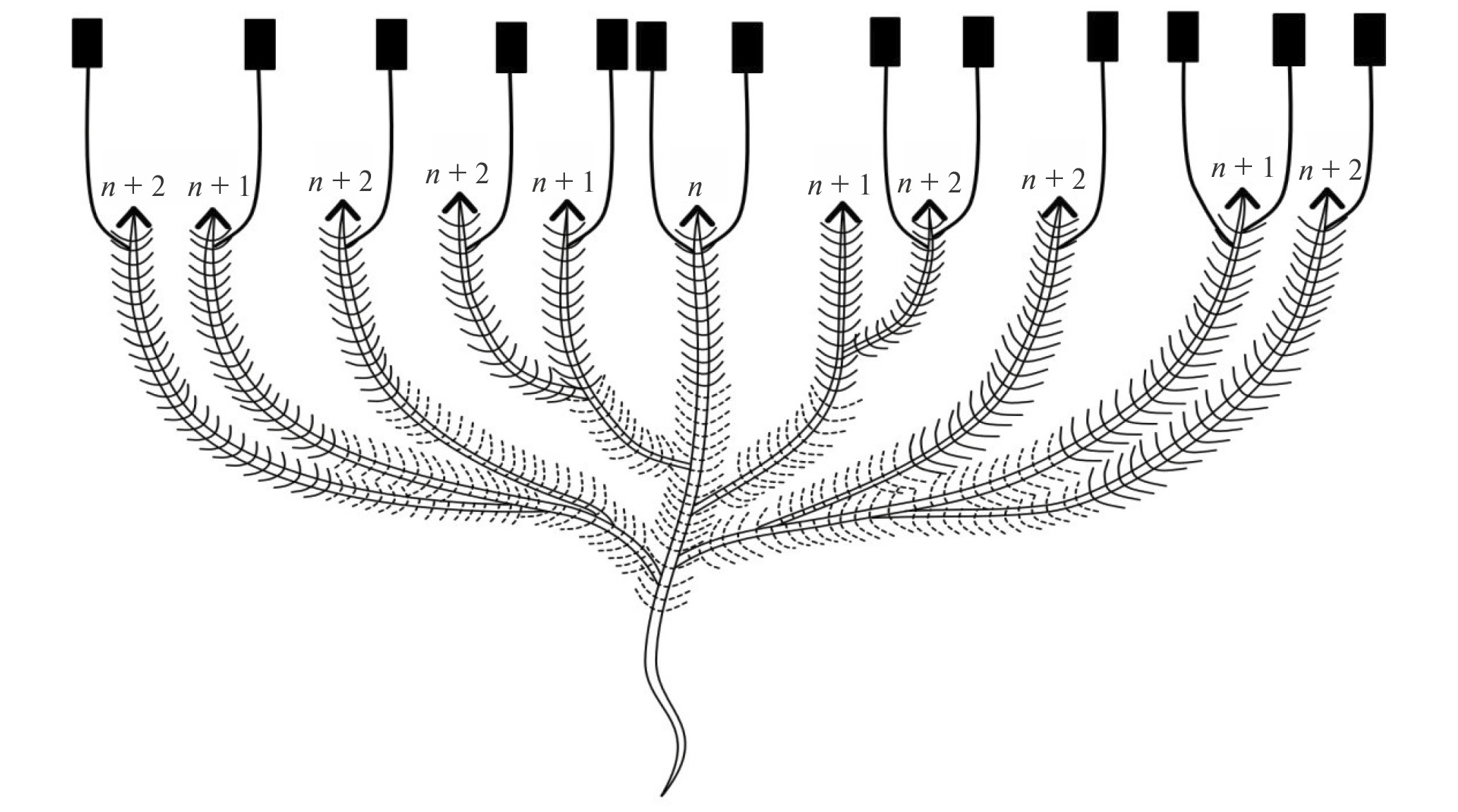 С. doerfleri. Растение в процессе развития образует плотную подушку, состоящую из густо олиственных побегов. Отмершие листья сохраняются на стеблях в основании побегов. Нарастание моноподиальное, однако на ранних этапах онтогенеза из пазушных почек на побеге первого порядка (n) появляются побеги второго порядка (n + 1) с анизотропным характером роста, которые активно растут в разных направлениях, захватывая ближайшую территорию (рис. 6). С увеличением порядка ветвления побегов рост осей начинает замедляться. На осях четвертого-пятого порядков (n + 3, n + 4) вегетативное разрастание прекращается, вероятно, в связи с нехваткой пространства внутри подушки для развития дополнительных побегов. Модель побегообразования – моноподиальная розеточная с мезотонией. Развитие подушки в онтогенезе растения происходит одновременно во многих плоскостях и направлениях.