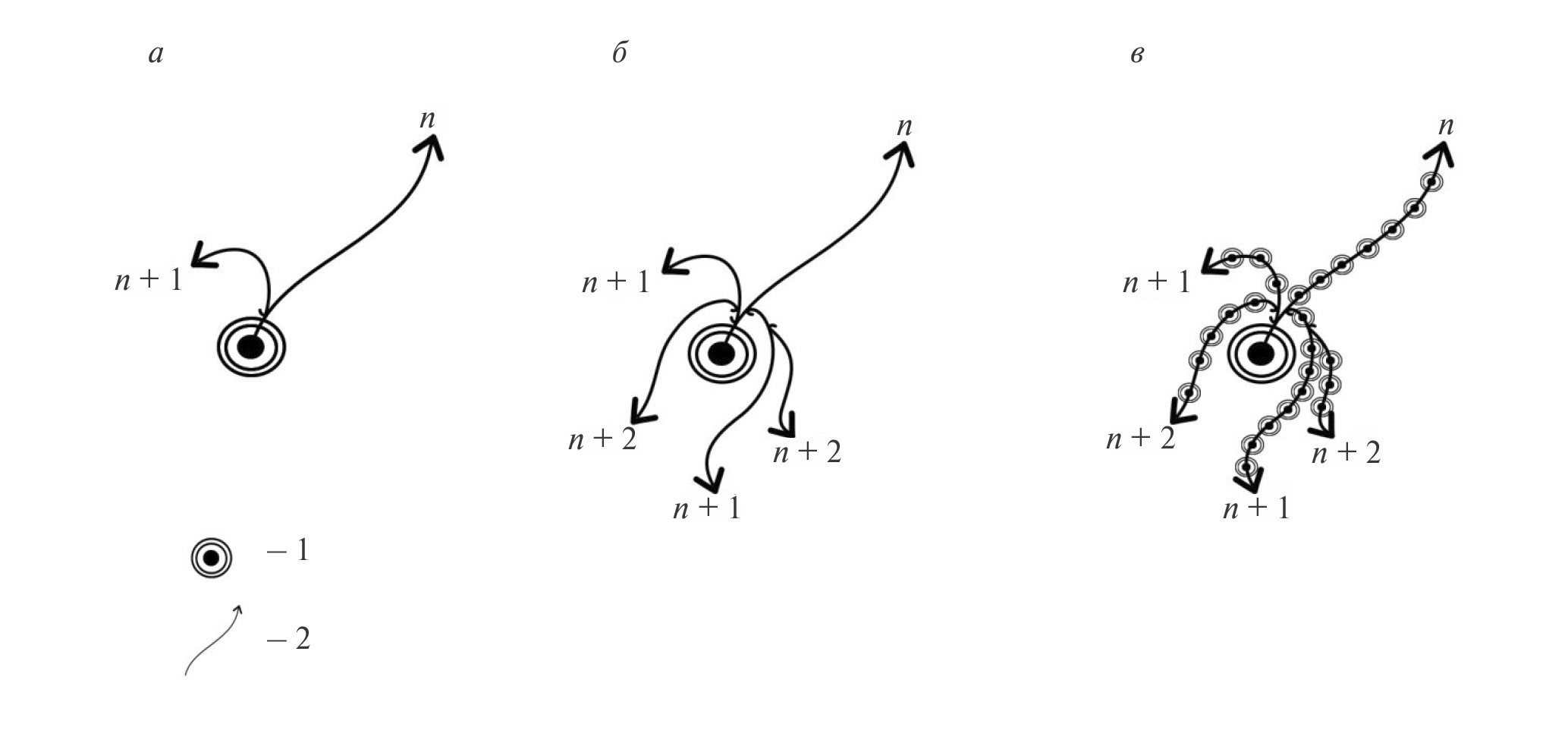 Рис. 1. Схема строения побегов C. аrctica: 1 – монокарпический побег; 2 – облиственный побег розеточного типа; 3 – побег розеточного типа с отмершими листьями. n, n + 1, n + 2 – порядок ветвления осей побега.