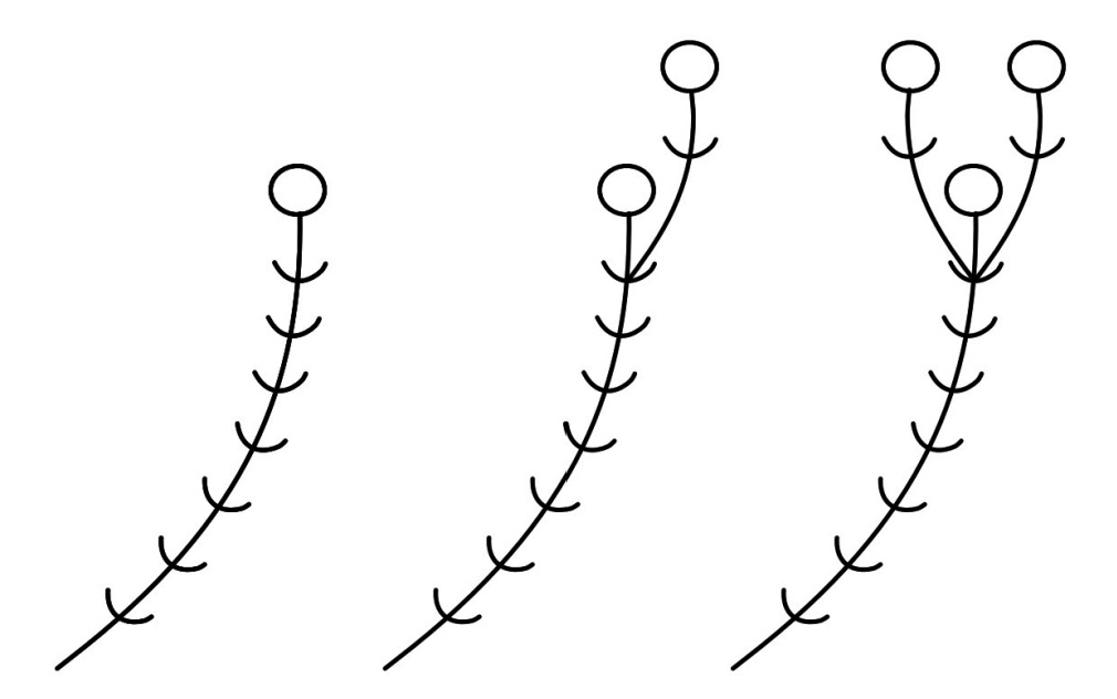 МК образуются из пазушных почек близ верхушек розеточных побегов и растут ортотропно. Первый вегетационный сезон МК находятся в фазе ассимилирующего розеточного побега, на следующий сезон переходят к цветению, таким образом, МК являются дициклическими. Во время цветения МК занимает псевдотерминальное положение. МК представлено или одним терминальным цветком, двуцветковым монохазием или же дихазием с небольшим числом флоральных элементов (обычно из трех цветков) (рис. 7).