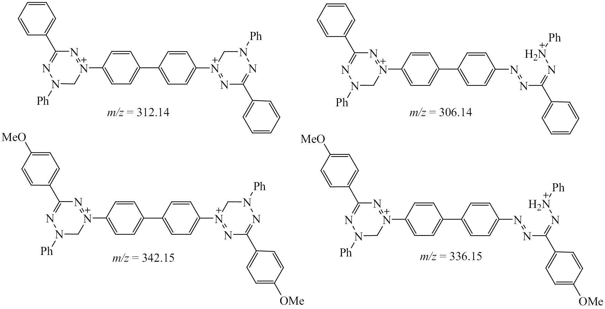 Бис(трифлат) 3,5-дифенил-1-{[4′-фенил-(2-фенилгидразинилидений)метил]диазенил-[1,1′-бифенил]-4-ил}-5,6-дигидро-1,2,4,5-тетразиния-1 (6а). Масс-спектр, m/z: 306.14. Rt = 19.5 мин.